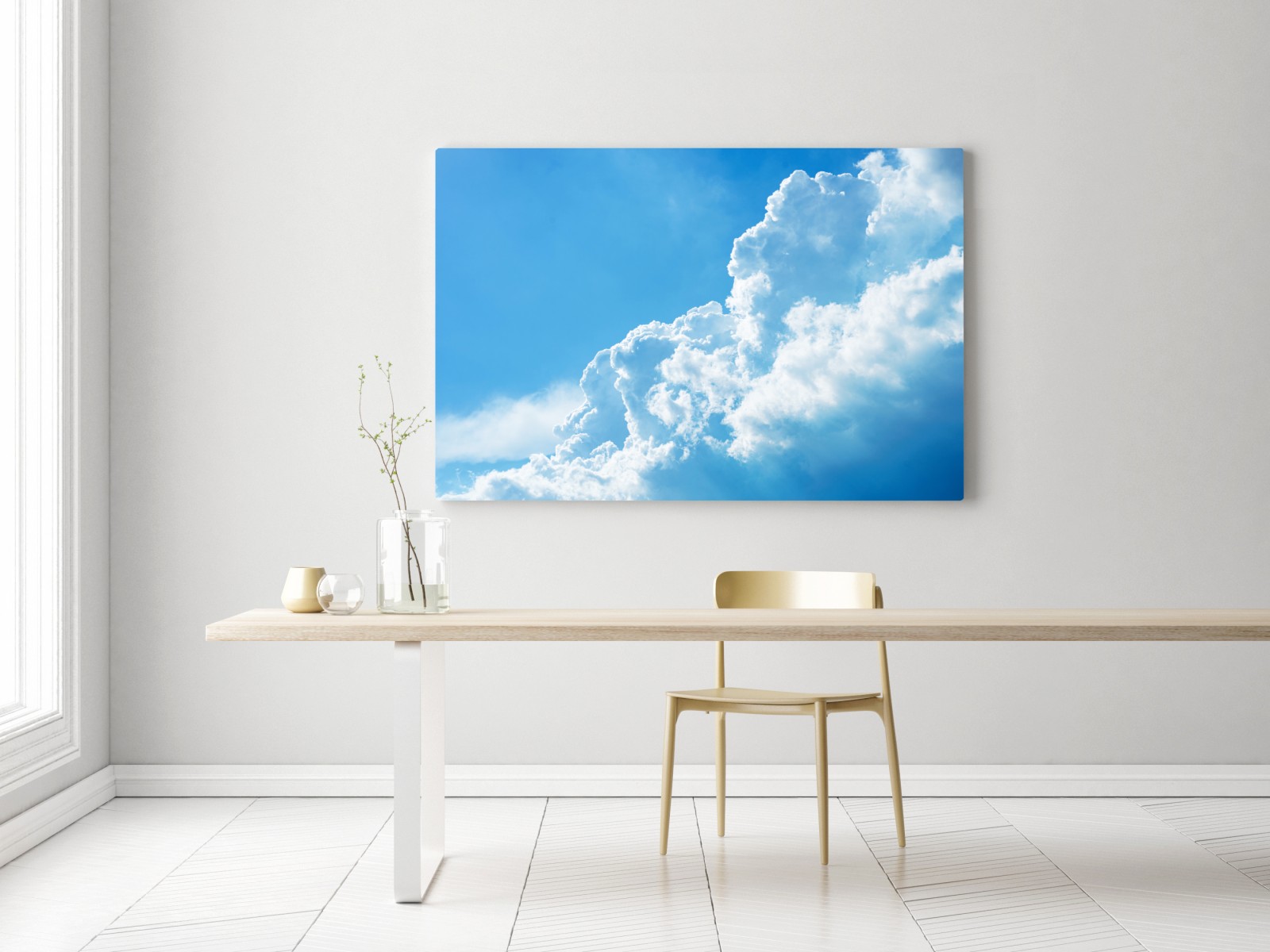 Ein beruhigendes Foto eines hellblauen Himmels mit fluffigen weißen Wolken, das jedem Raum Licht und Ruhe verleiht.