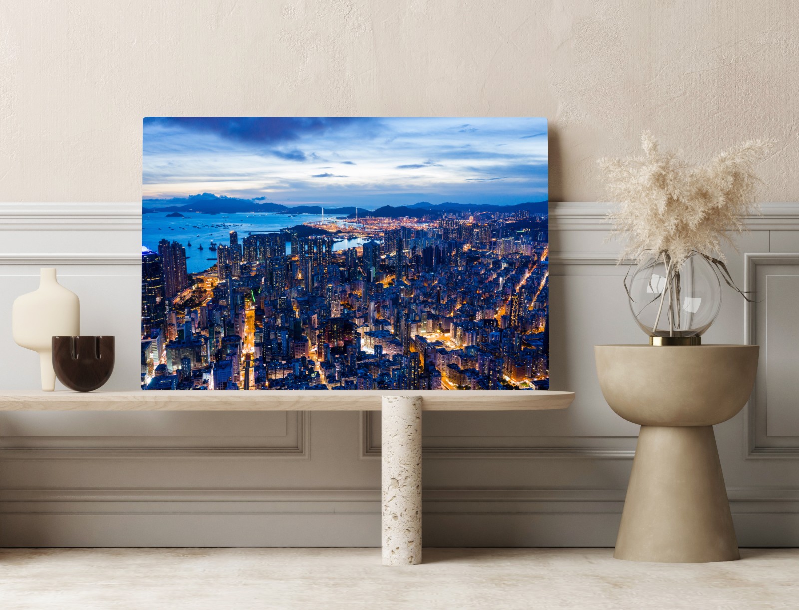 Dramatische Luftaufnahme der beleuchteten Skyline von Hongkong in der Dämmerung, ideal zur Schaffung urbaner Energie und Tiefe in jedem Raum.
