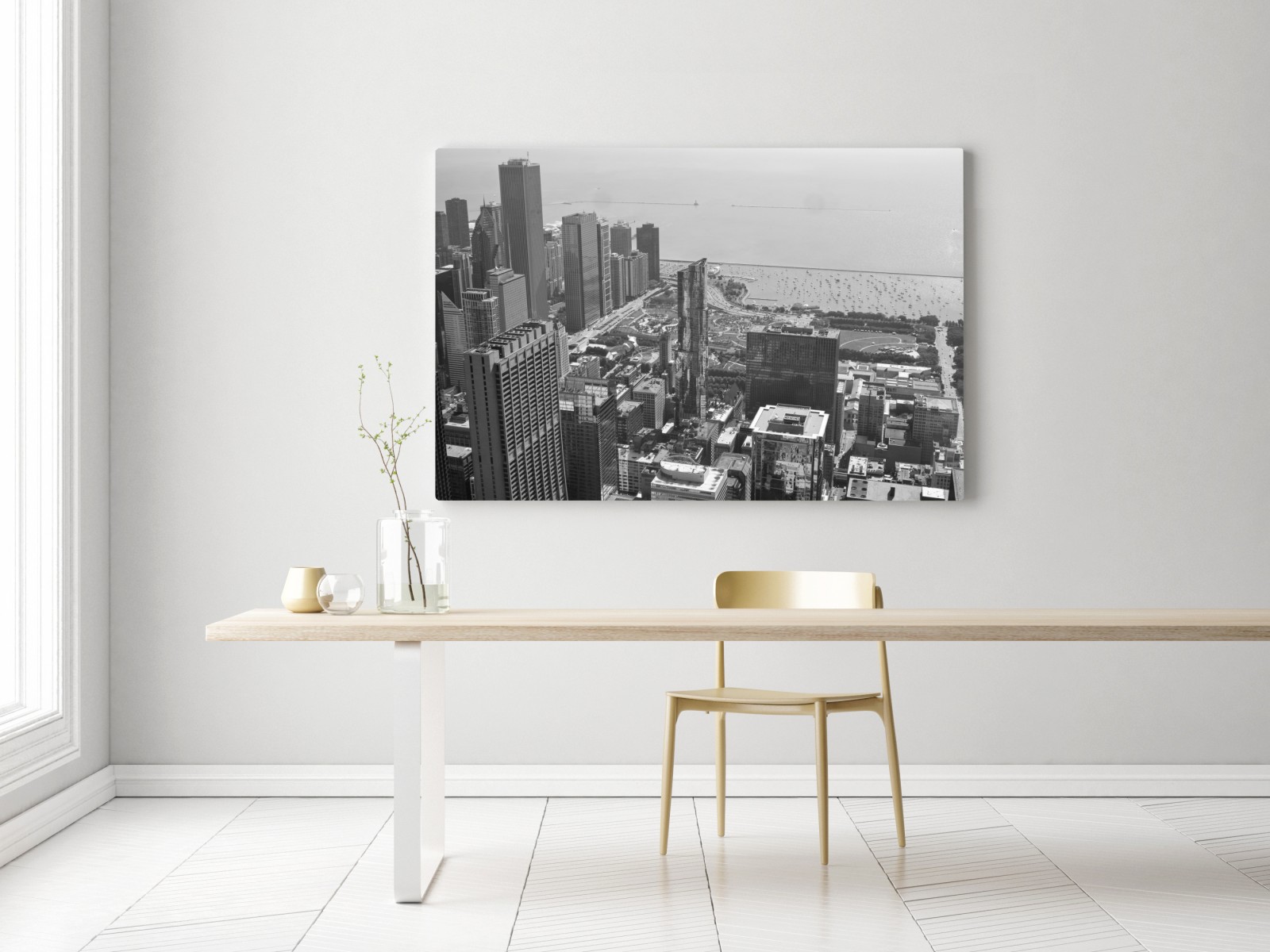 Ein eindrucksvolles monochromes Luftbild einer modernen Stadtsilhouette am Ufer, ideal um jedem Raum urbane Eleganz zu verleihen.