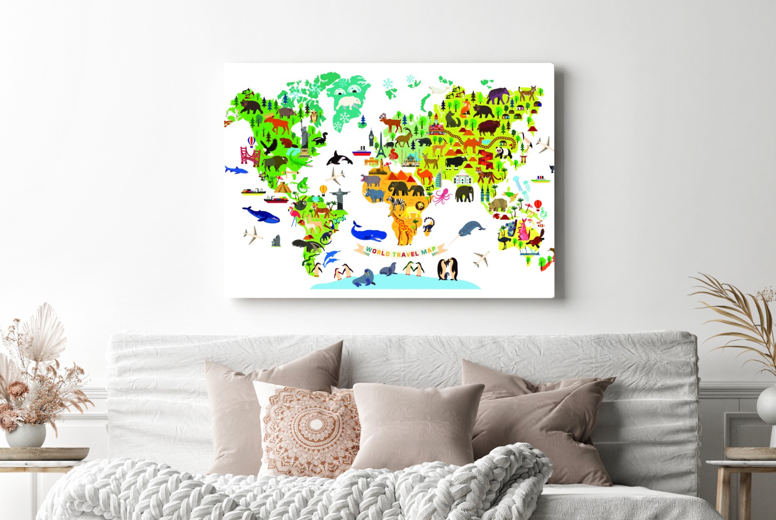 verspielte illustrierte weltkarte mit tieren und bekannten sehenswürdigkeiten, perfekt zur dekoration im kinderzimmer und um neugier auf geographie und natur zu wecken.