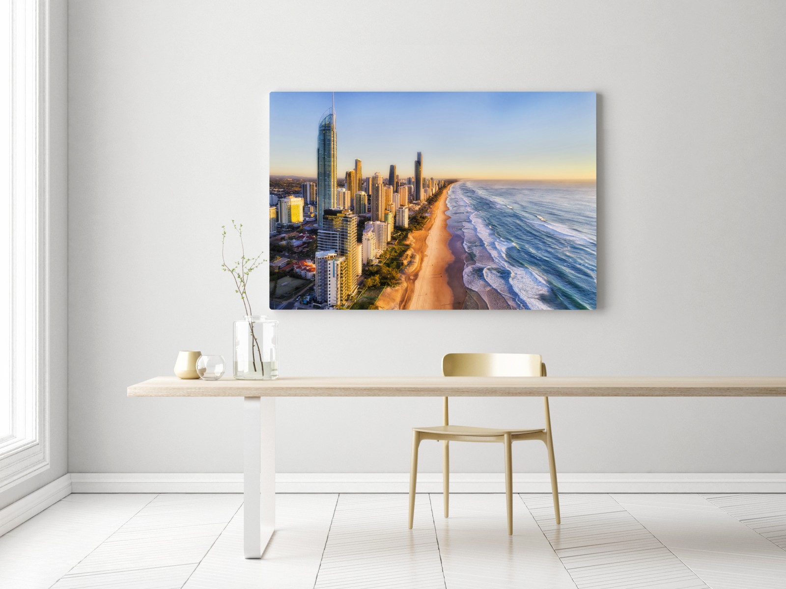 Luftaufnahme von Surfers Paradise Strand und Skyline bei Sonnenaufgang, perfekt um maritimen Flair und urbane Eleganz in jedes Zuhause zu bringen.