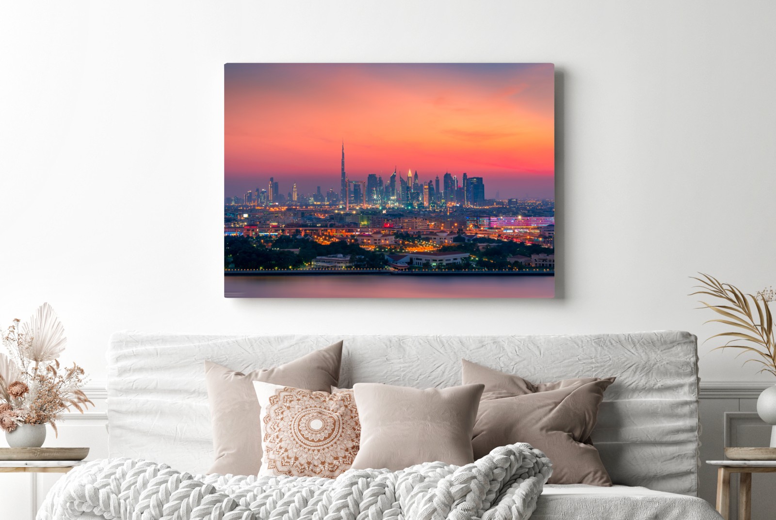 Ein lebendiges Panorama der Skyline von Dubai bei Sonnenuntergang, das warme Farben und Stadtlichter kombiniert und jeden Raum zum Blickfang macht.