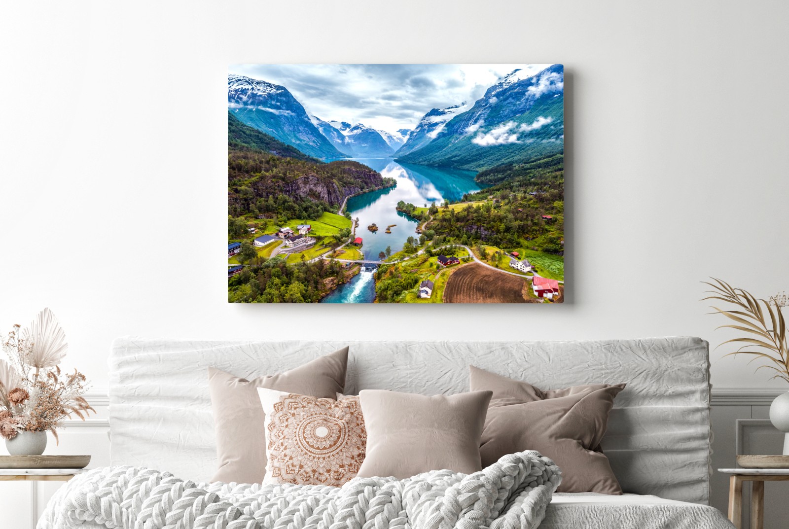 Atemberaubende Luftaufnahme eines norwegischen Fjords mit türkisblauem Wasser und imposanten Bergen, ideal um natürliche Ruhe in jeden Raum zu bringen.