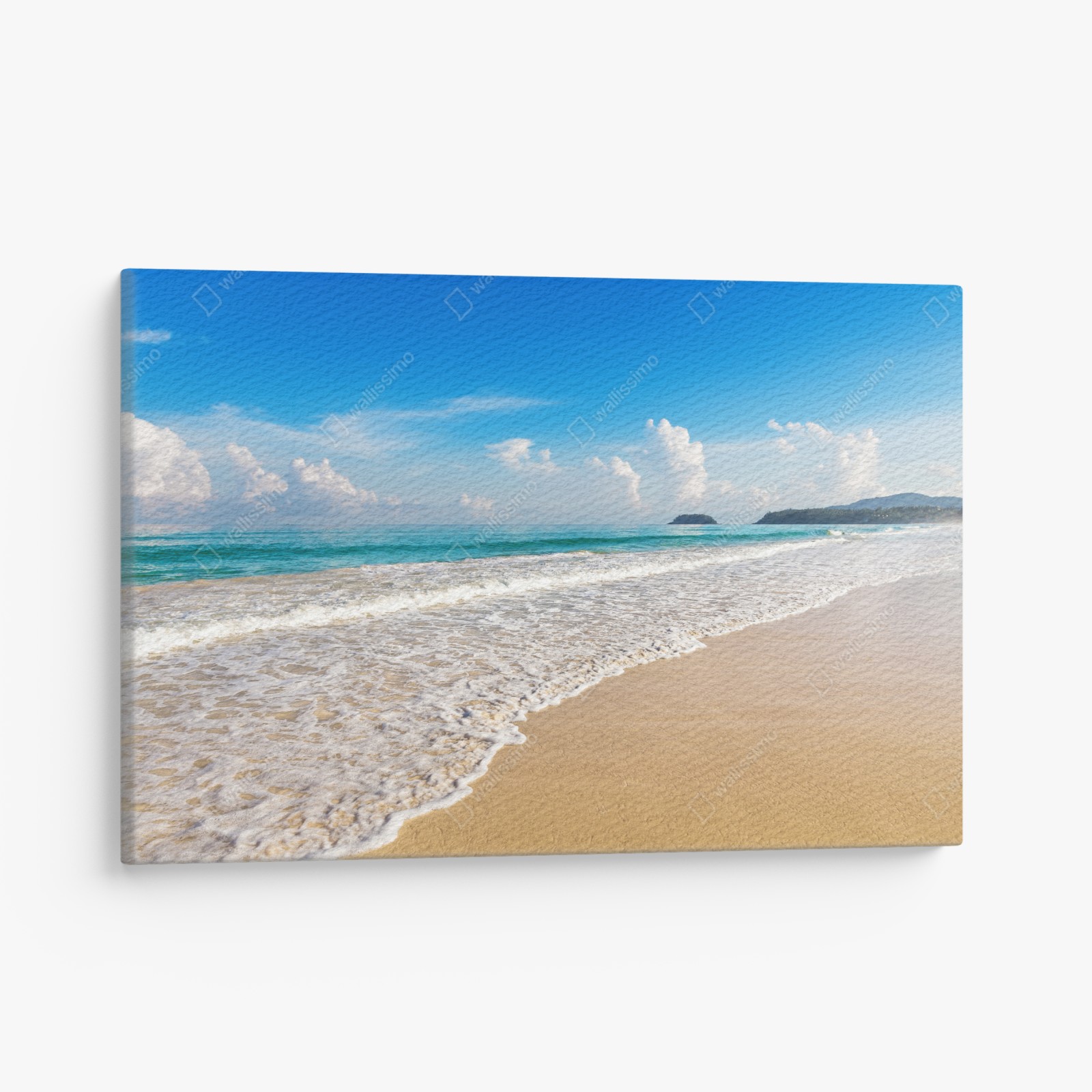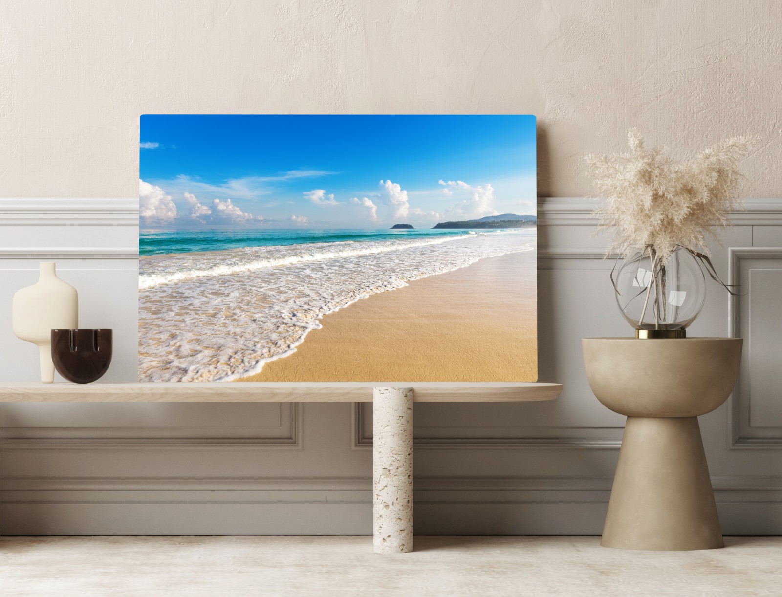 Bringen Sie die beruhigende Atmosphäre des Karon Strandes in Ihren Raum mit dieser lebendigen Meeresaufnahme mit türkisblauem Wasser, goldenem Sand und klarem Himmel.