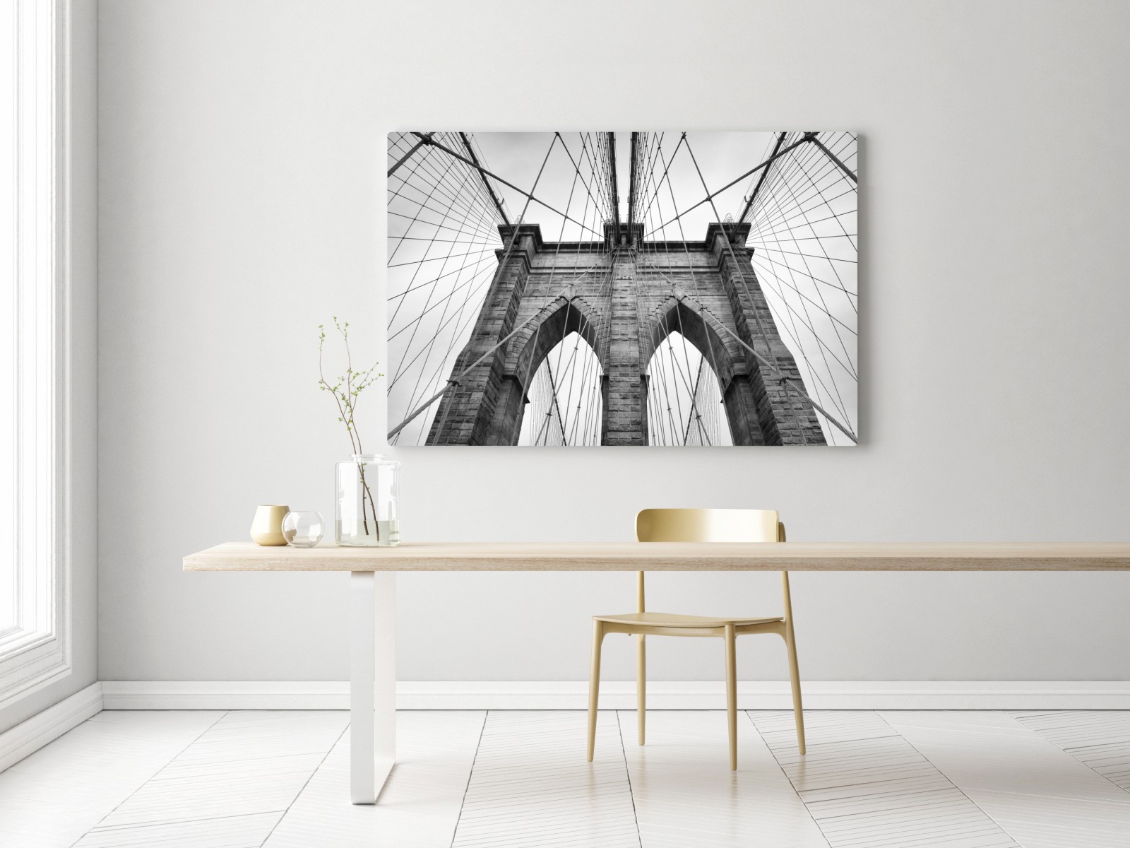 Markantes schwarzweißes Motiv einer Hängebrücke mit klaren Linien und symmetrischer Komposition, ideal für moderne Wohnräume.