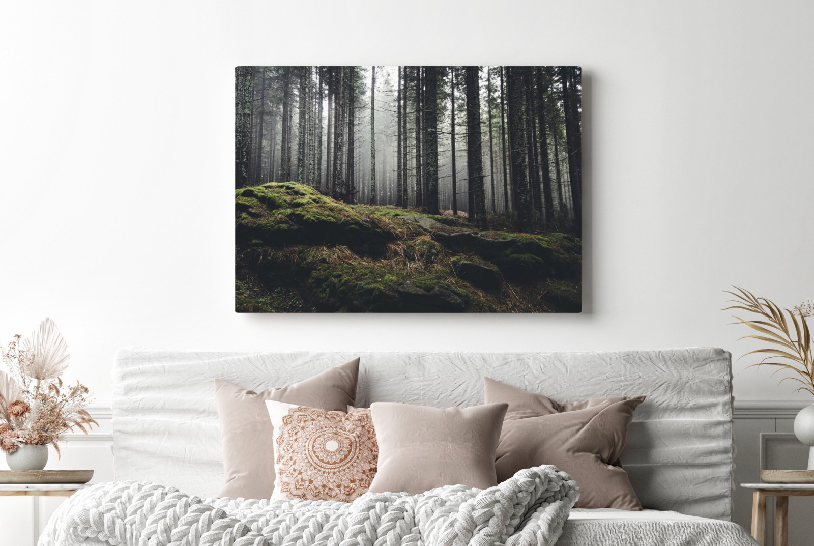 Ein nebliger Kiefernwald mit moosbedeckten Felsen schafft Ruhe und natürliche Atmosphäre an Ihrer Wand.
