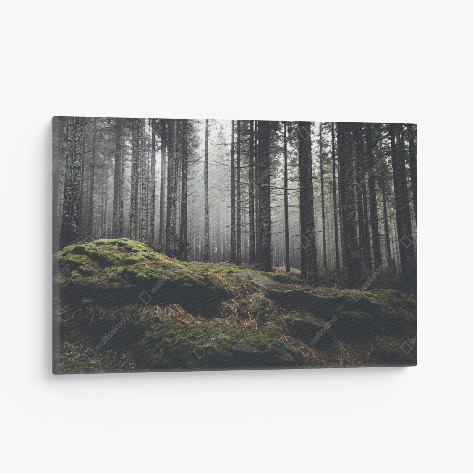 Ein nebliger Kiefernwald mit moosbedeckten Felsen schafft Ruhe und natürliche Atmosphäre an Ihrer Wand.MehrWeniger