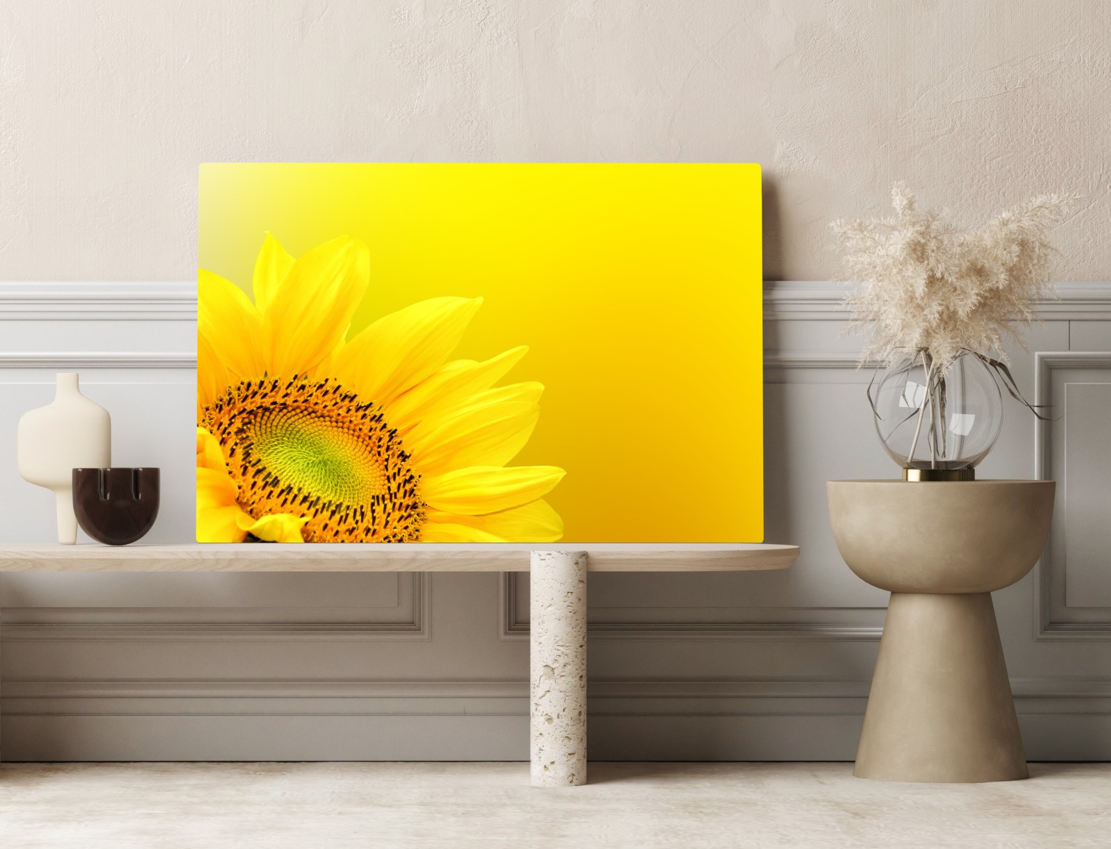 Leuchtende Nahaufnahme einer Sonnenblume auf warmem gelben Hintergrund, die natürlichen Schwung und Fröhlichkeit in jeden Raum bringt.