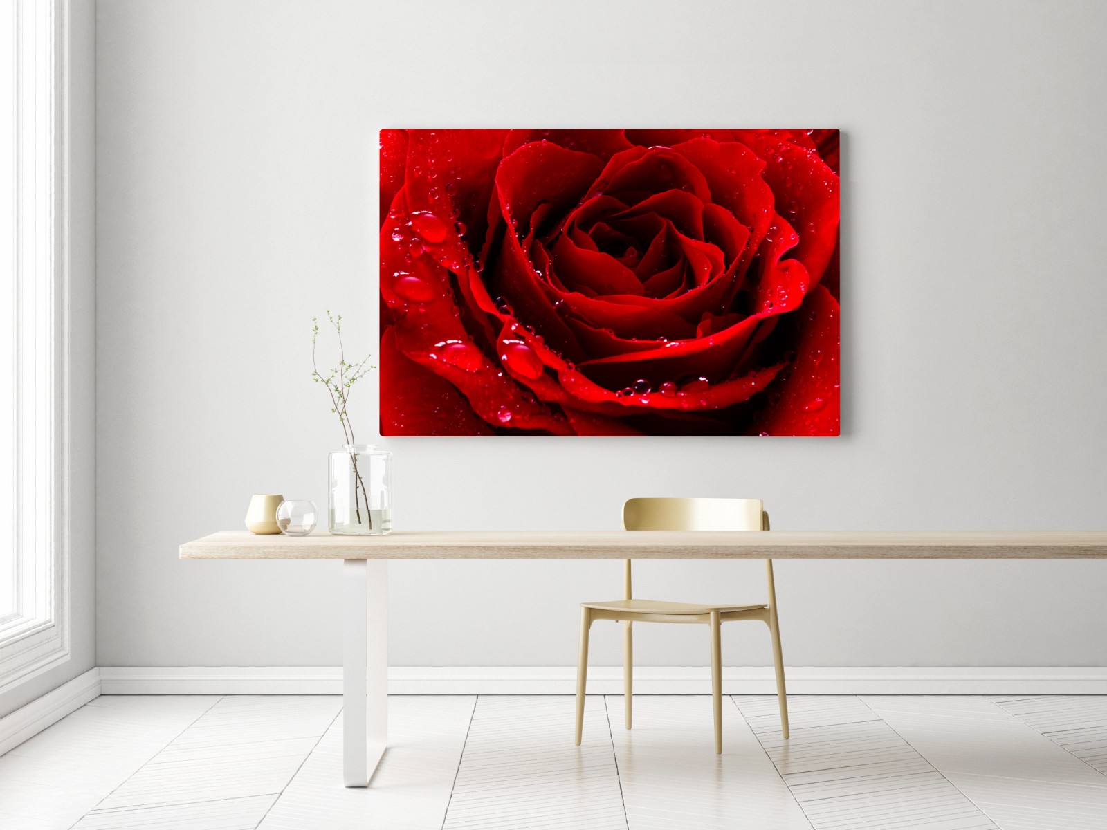 Ein beeindruckendes Close-up einer taufrischen roten Rose, das romantische Eleganz und intensive Farbe an jede Wand bringt.