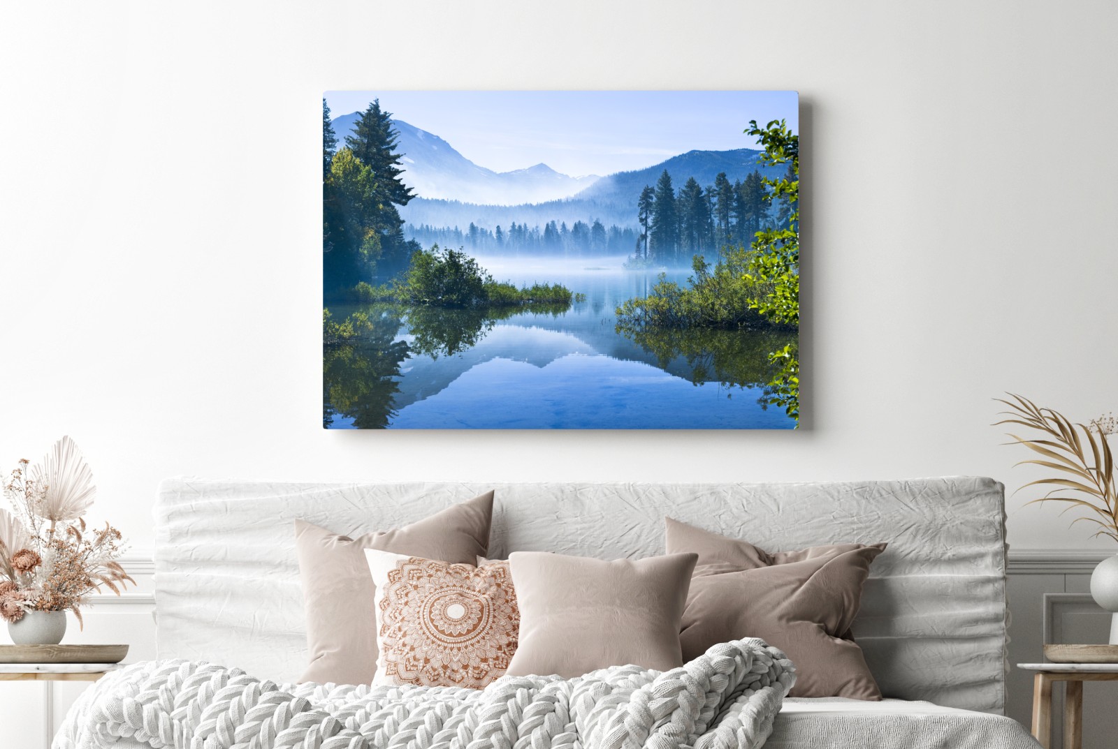 Leinwandbild nebliger bergsee mit spiegelnder oberfläche – Wallnifity®