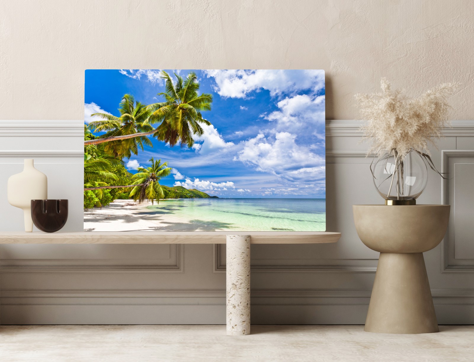 Bringen Sie inselartige Ruhe in Ihr Zuhause mit diesem lebendigen Motiv einer tropischen Strandlandschaft mit wiegenden Palmen, kristallklarem Wasser und strahlend blauem Himmel—perfekt, um jedem Raum eine entspannte Urlaubsstimmung zu verleihen.