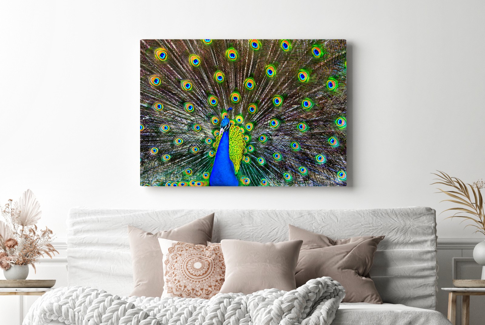 Beeindruckende Nahaufnahme irisierender Pfauenfedern, die jedem Raum exotische Farben und elegante Akzente verleiht.