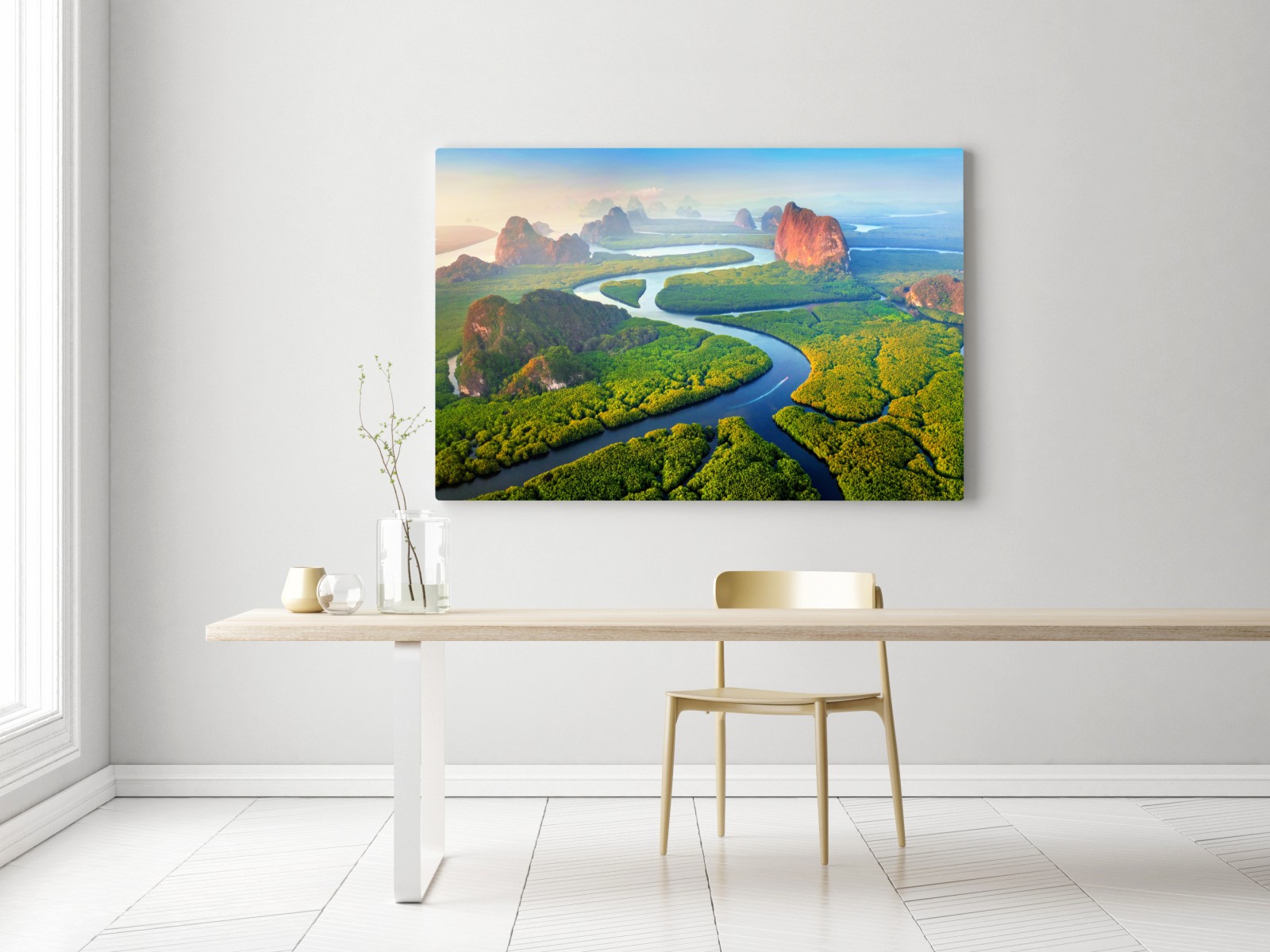 Atemberaubende Luftaufnahme der Phang Nga Bucht bei Sonnenaufgang mit gewundenen Flüssen und üppigen Mangroven, ideal zur Schaffung einer natürlichen Atmosphäre.