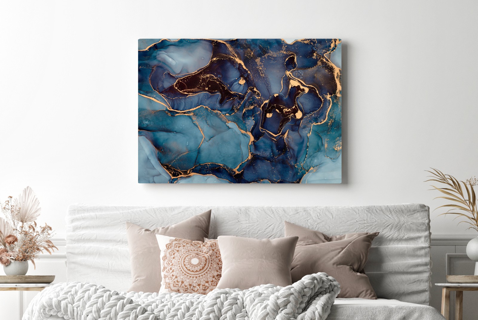Luxuriöse abstrakte Fluidkunst in tiefen Blautönen mit goldenen Akzenten, die modernen Stil und ruhige Bewegung in jeden Raum bringt.