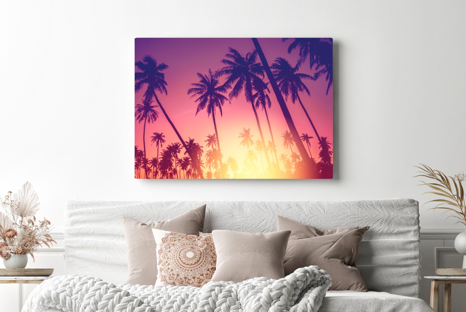 Lebendiger tropischer Sonnenuntergang mit Palmensilhouetten und warmer Duotone-Palette, der jedem Raum sommerliches Flair verleiht.