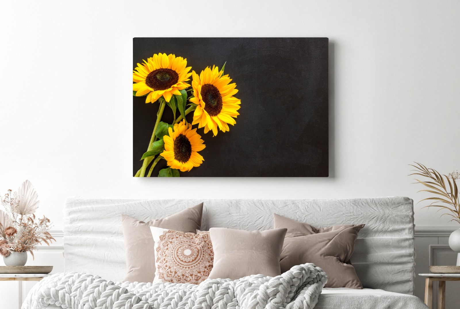 Helle sonnenblumen vor dunklem hintergrund verleihen jedem raum warme, natürliche schönheit.