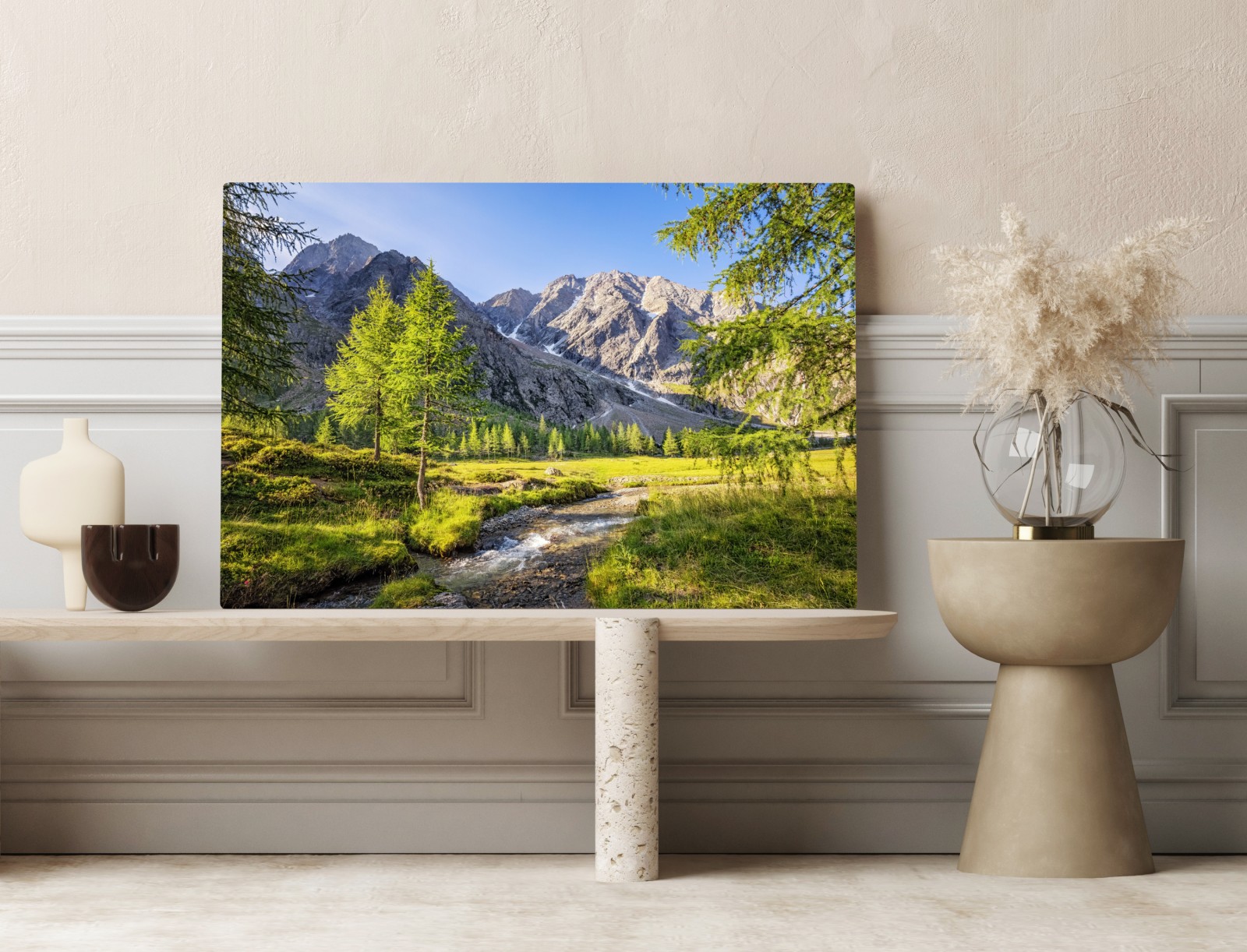 Bringen Sie alpine Ruhe in Ihren Raum mit dieser lebendigen Landschaft aus klarem Bach, sonnenbeschienenen Wiesen und markanten Gipfeln.