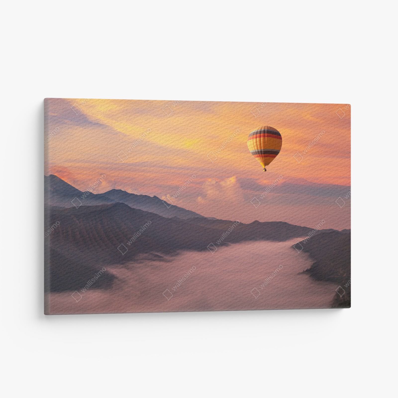 eine lebendige szene bei sonnenaufgang mit einem heißluftballon über nebligen bergen, die wärme und ruhe in jeden raum bringt.