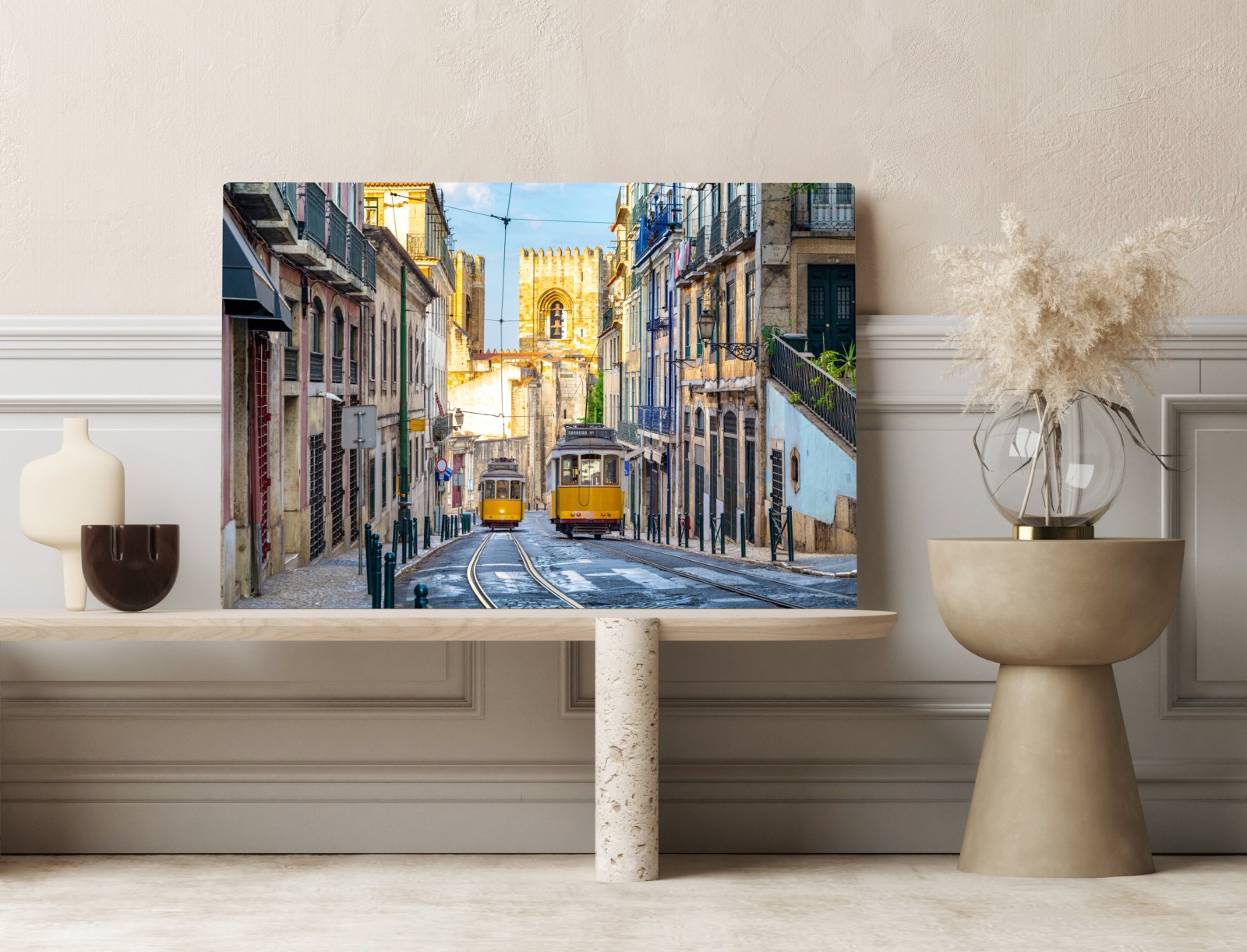 Lebendige, sonnige Straßenszene in Lissabon mit ikonischen gelben Straßenbahnen vor historischer Architektur — perfektes reiseinspiriertes Wandbild.