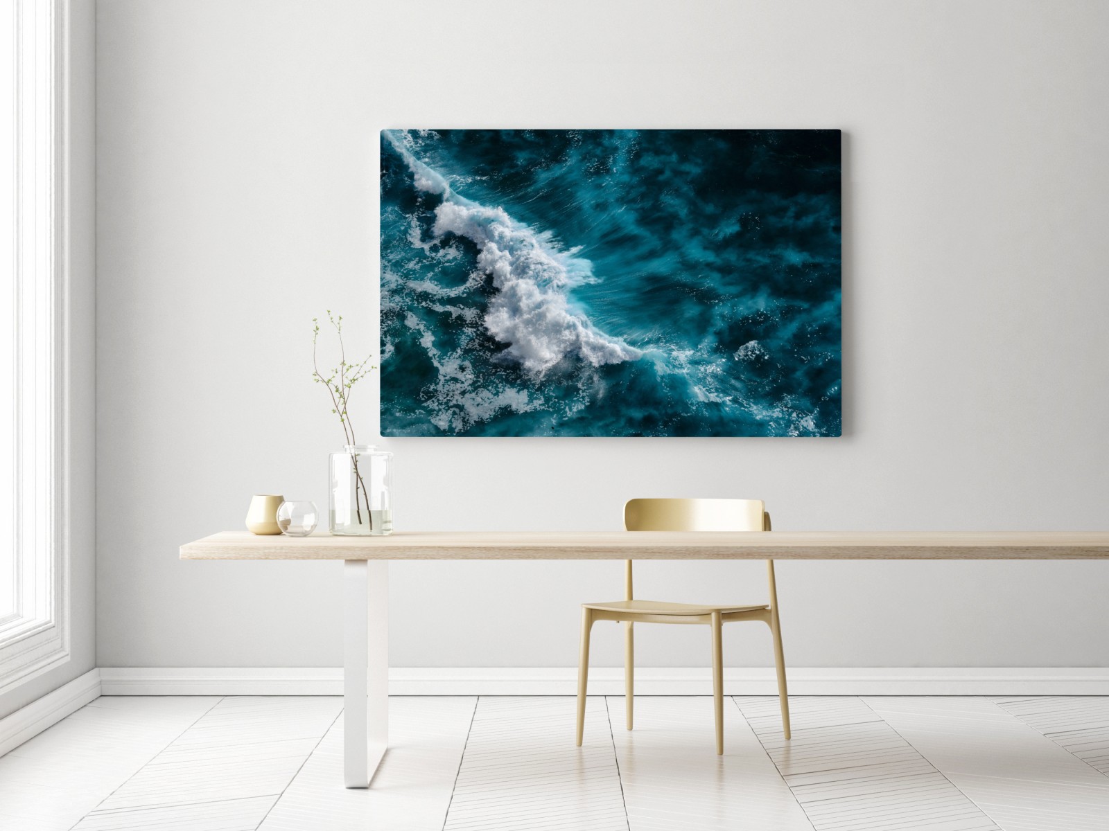 Beeindruckende Luftaufnahme türkiser Ozeanwellen mit weißer Gischt, die maritimes Flair und Ruhe in Ihr Interieur bringt.