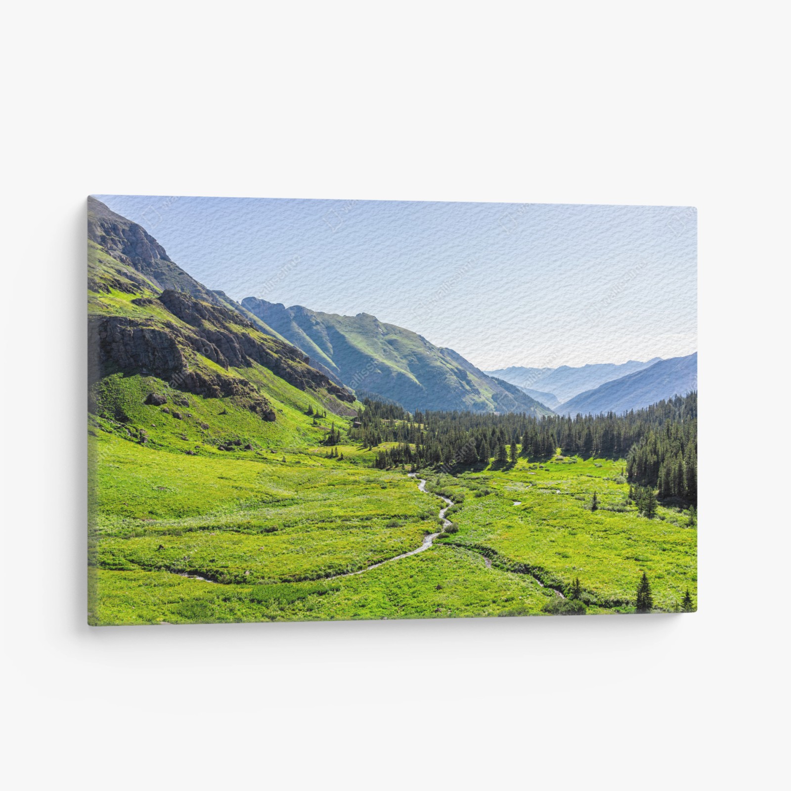 Bringen Sie alpine Ruhe an die Wand mit diesem lebendigen Foto eines grünen Tals, eines mäandernden Bachs und entfernter Gipfel.MehrWeniger