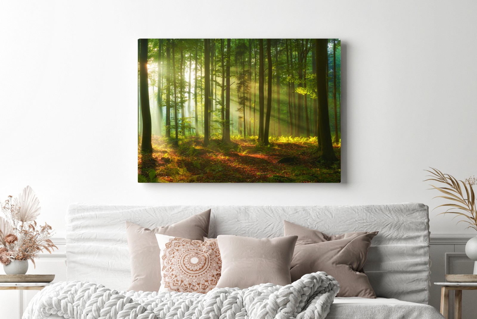 Eine ruhige Waldszene im warmen Morgenlicht, ideal um jedem Raum Ruhe, natürliche Schönheit und einen Hauch von Grün zu verleihen.