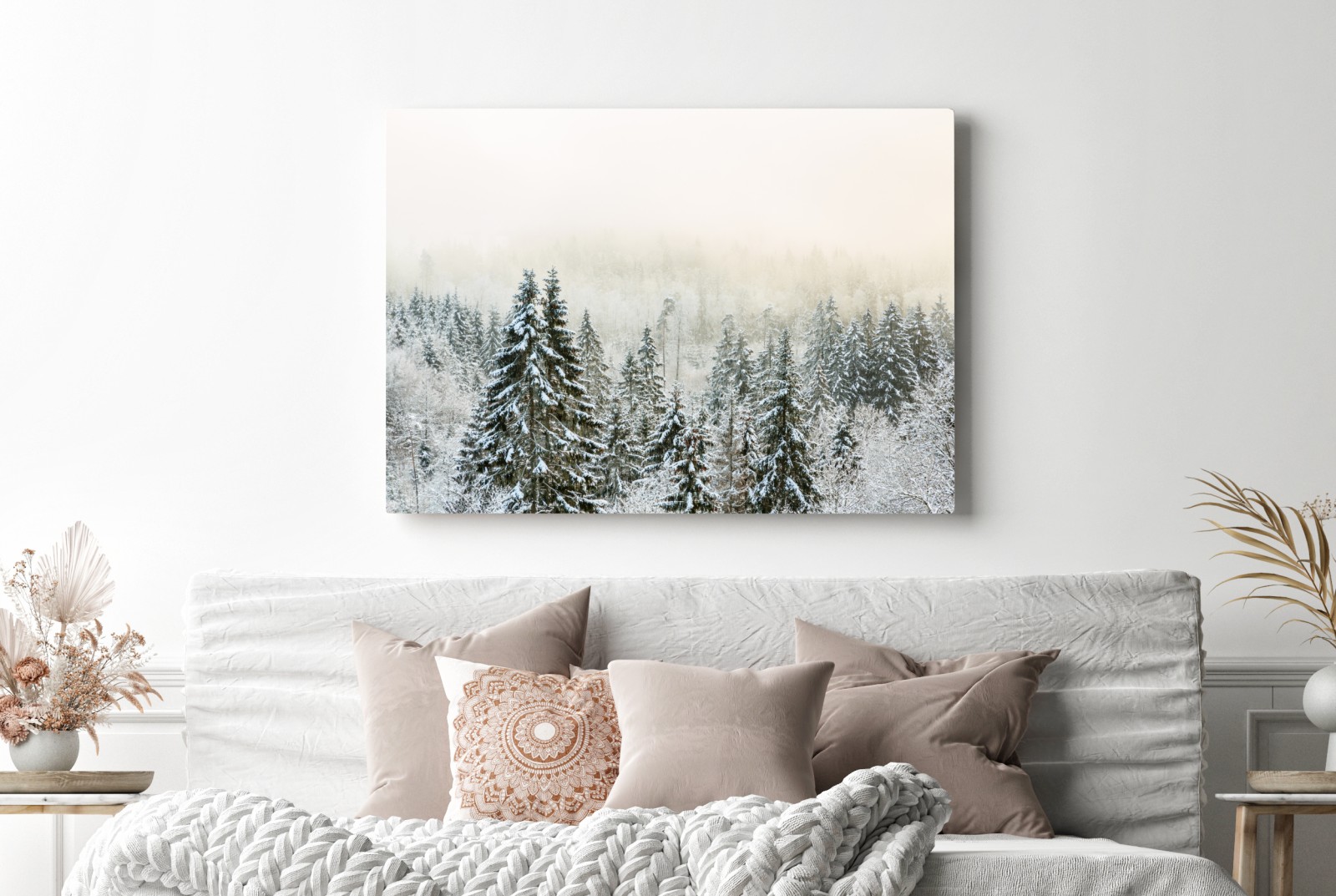 Eine ruhige Winterszene mit schneebedeckten Kiefern und sanftem Nebel, ideal um natürliche Gelassenheit in jeden Raum zu bringen.