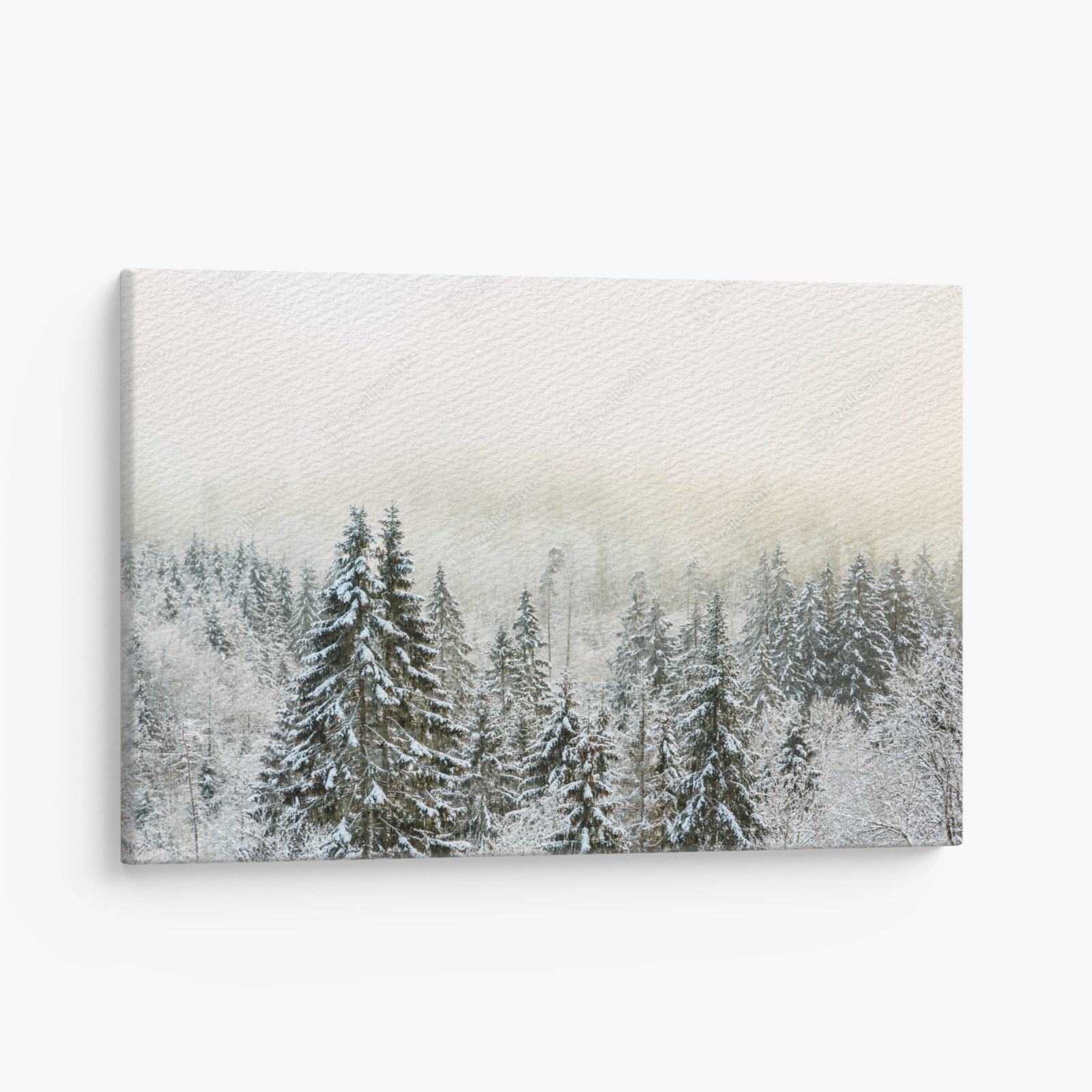 Eine ruhige Winterszene mit schneebedeckten Kiefern und sanftem Nebel, ideal um natürliche Gelassenheit in jeden Raum zu bringen.MehrWeniger
