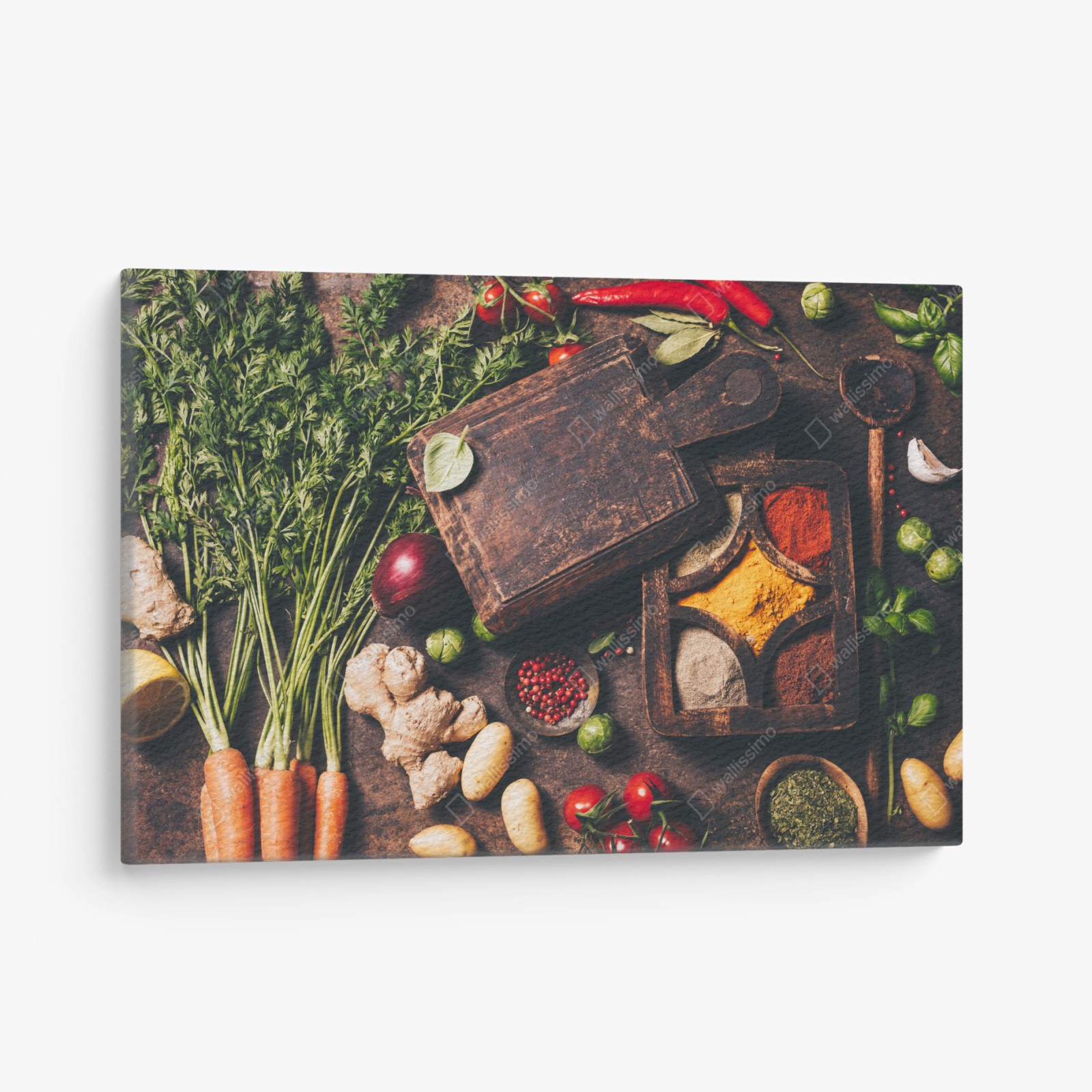 Leinwandbild Rustikales stillleben mit gewürzen und gemüse
