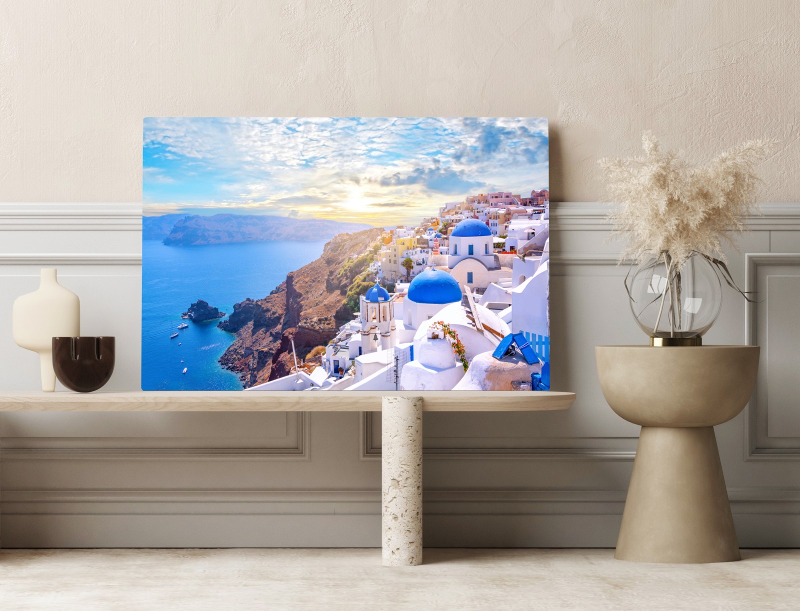 Heller küstenblick auf Oia mit den ikonischen blauen kuppeln und weiß getünchten häusern, der mediterranes flair in jeden raum bringt.