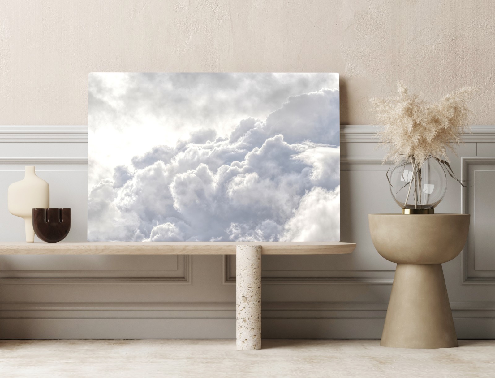 Beruhende wolkenlandschaft in sanften weißen und grauen tönen die jedem raum leichtigkeit und ruhe verleiht.