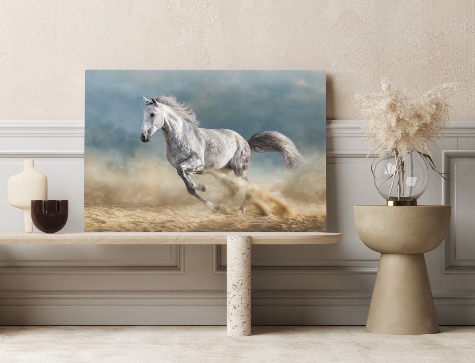 Leinwandbild majestätisches graues pferd galoppiert durch den sand – Wallnifity®