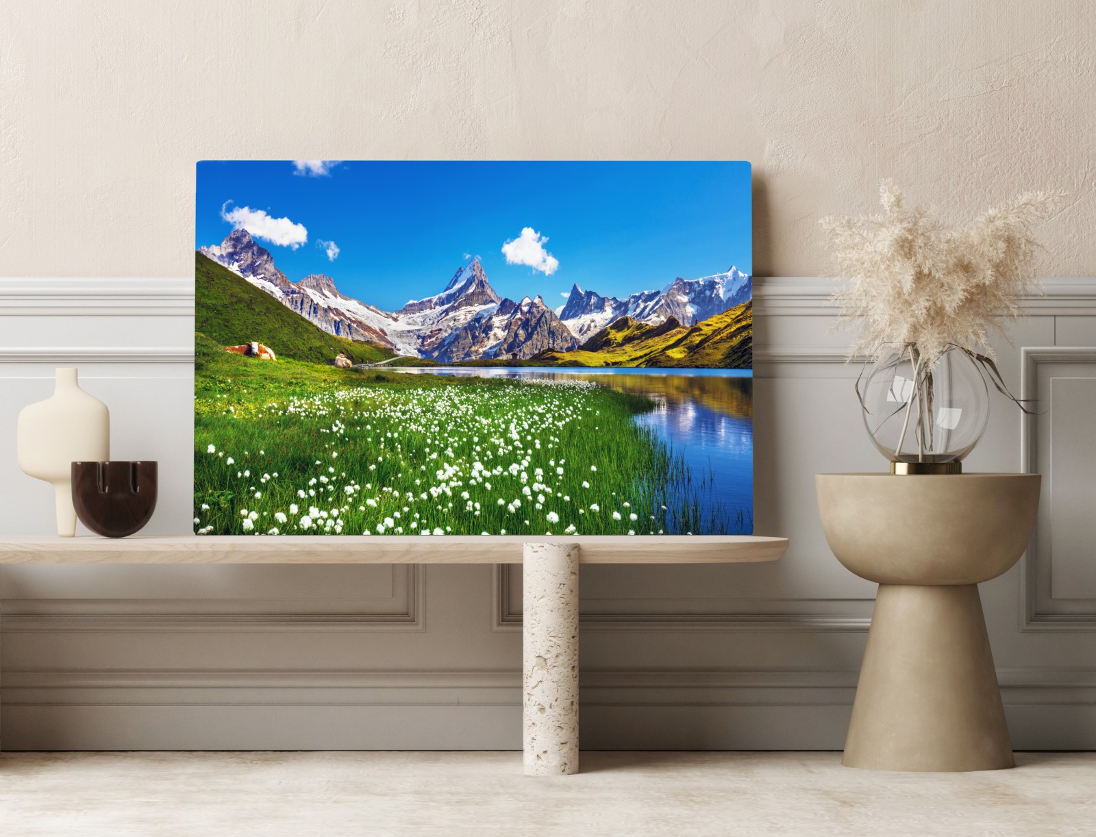 Leinwandbild alpensee mit blumenwiese und berggipfeln – Wallnifity®