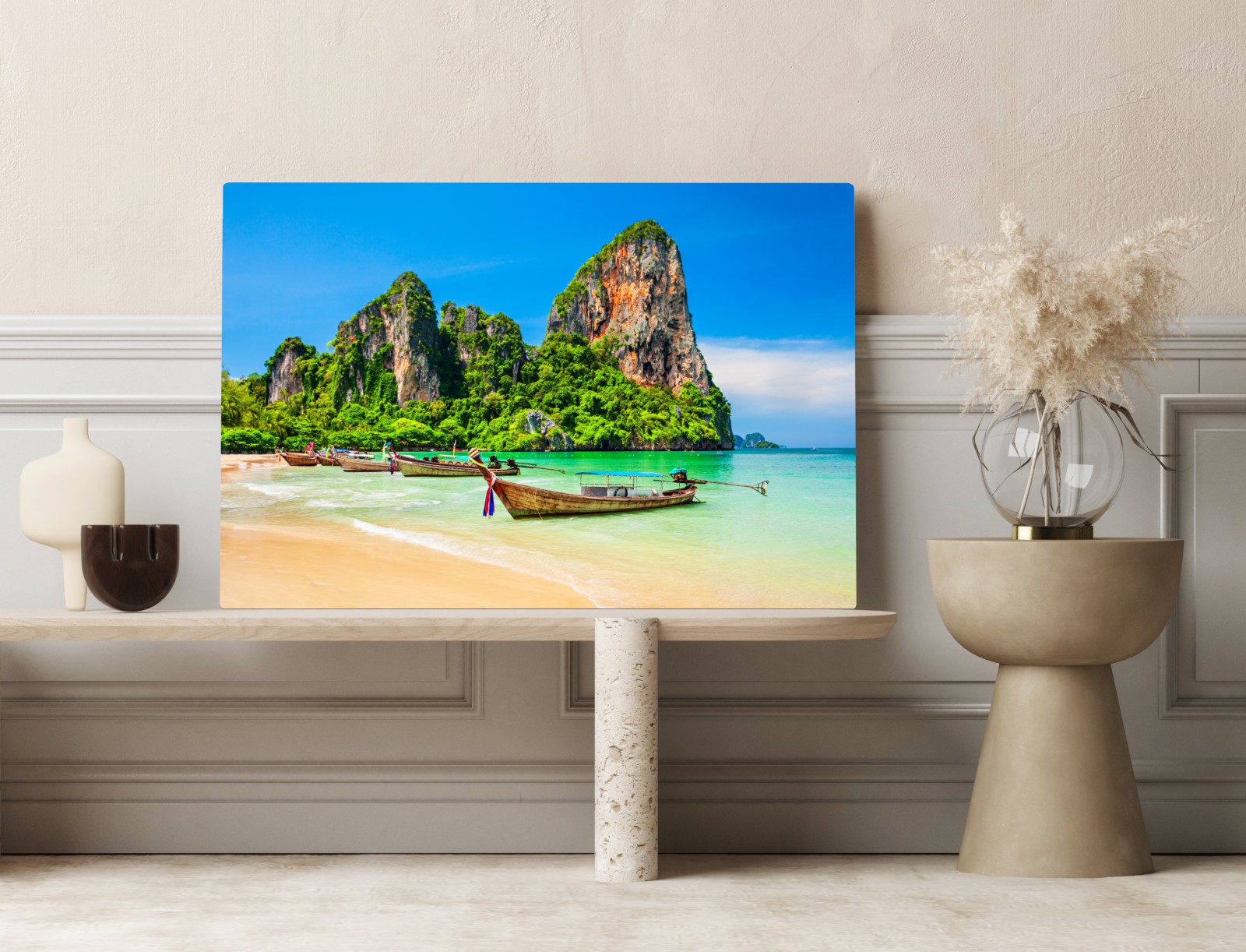 Lebendige tropische Meereslandschaft mit Longtail-Booten, türkisfarbenem Wasser und dramatischen Kalkfelsen, die Ruhe und Fernweh vermittelt.