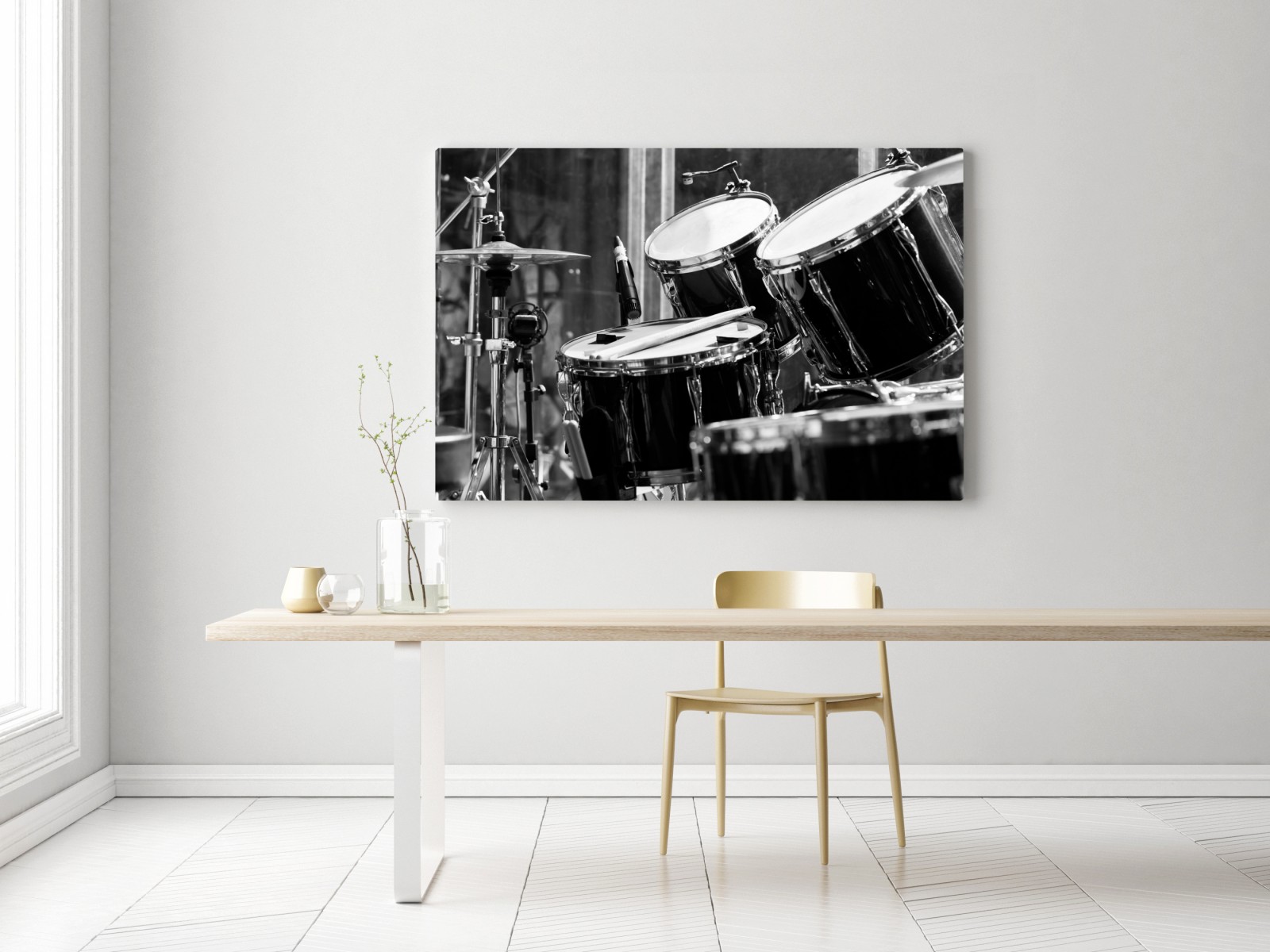Ausdrucksstarkes Schwarzweißfoto eines Schlagzeugs, das die Energie der Livemusik und die Präzision des Studios einfängt, ideal für moderne Wohnräume.