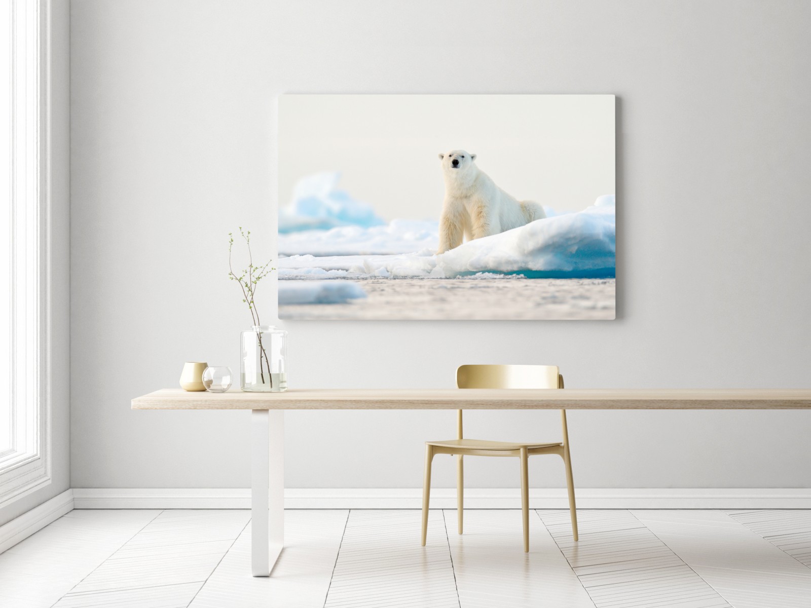 Beeindruckendes Foto eines Eisbären auf treibendem Eis bei Svalbard, ideal für Naturfans und moderne Wohnräume.