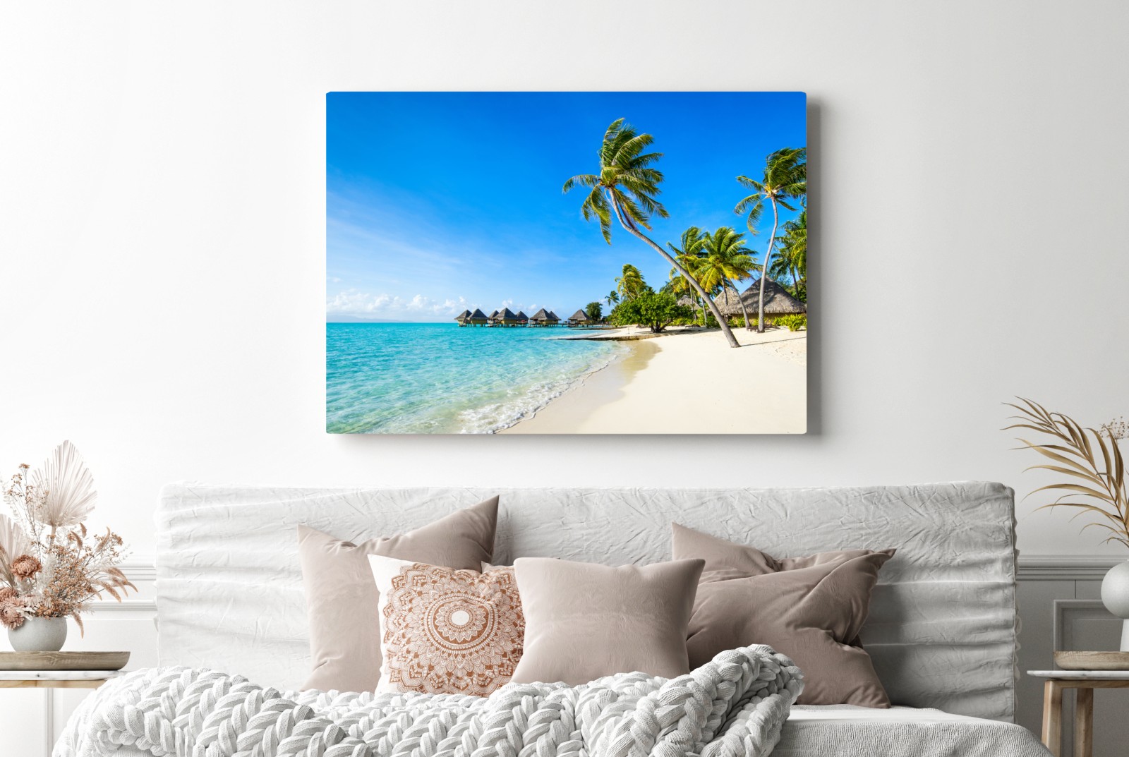 Helles tropisches Strandmotiv mit türkisblauem Wasser und wiegenden Palmen, das eine entspannte Inselatmosphäre in jeden Raum bringt.