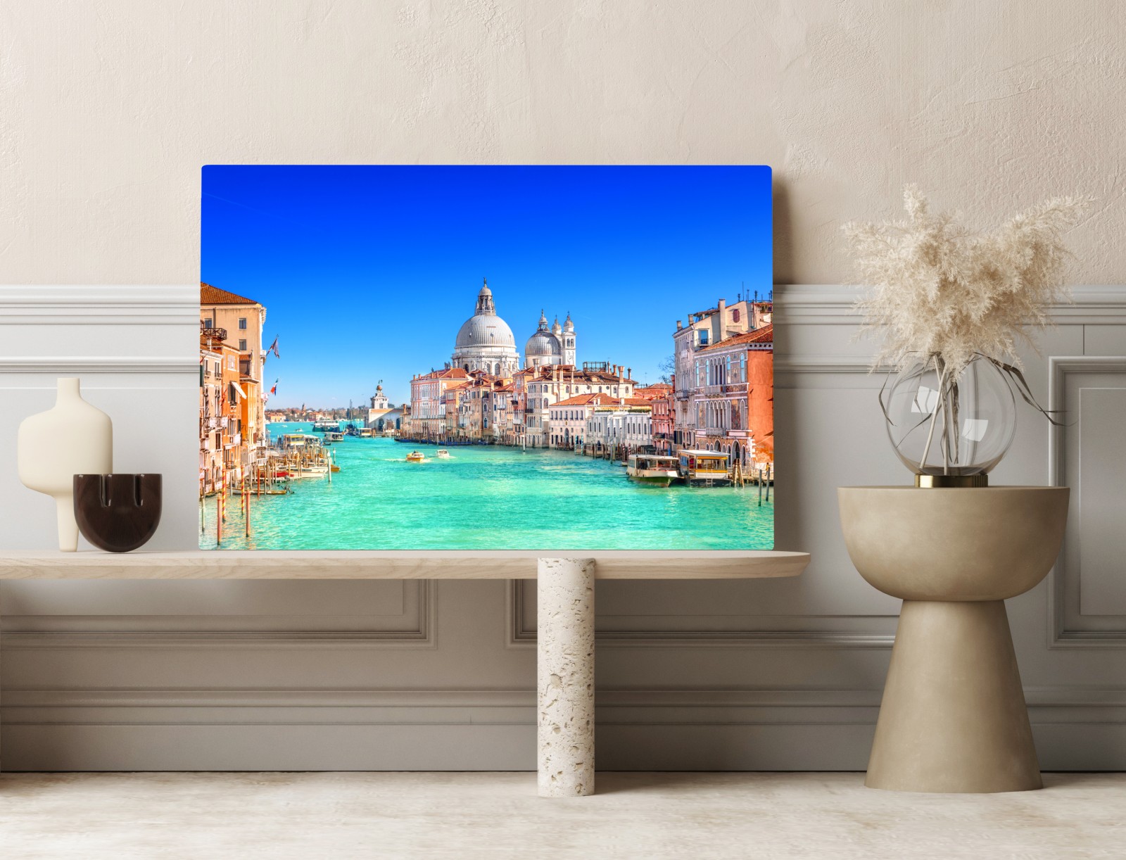 Helle Panoramaansicht des Canal Grande und der Basilika Santa Maria della Salute bringt mediterranen Charme und historische Architektur in jeden Raum.