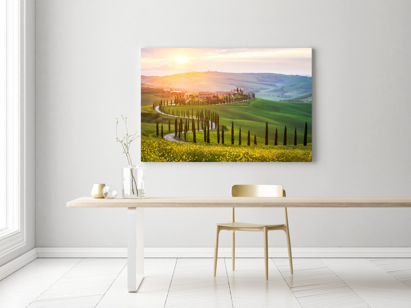 warmer sonnenaufgang taucht toskanische hügel und eine von zypressen gesäumte kurvenstraße in goldenes licht und verleiht dem raum ruhige landhausatmosphäre.