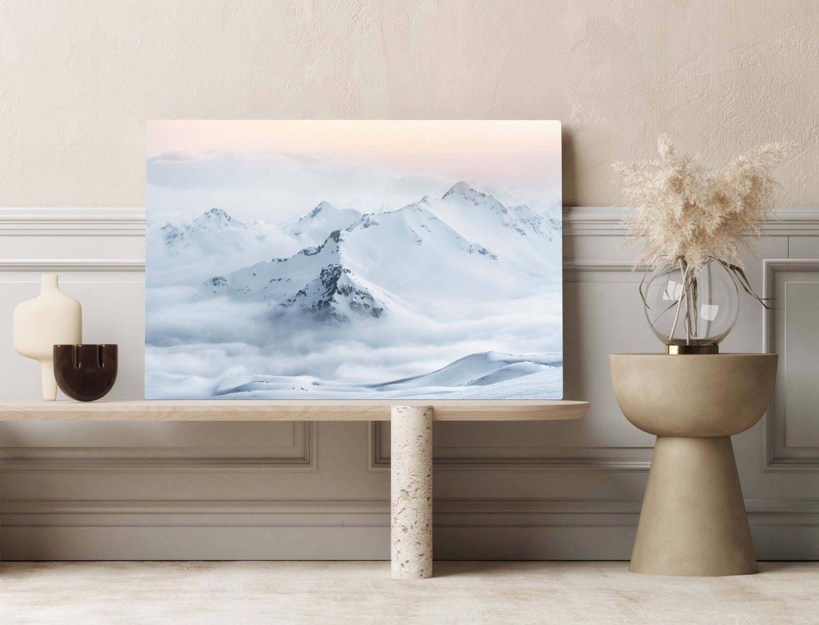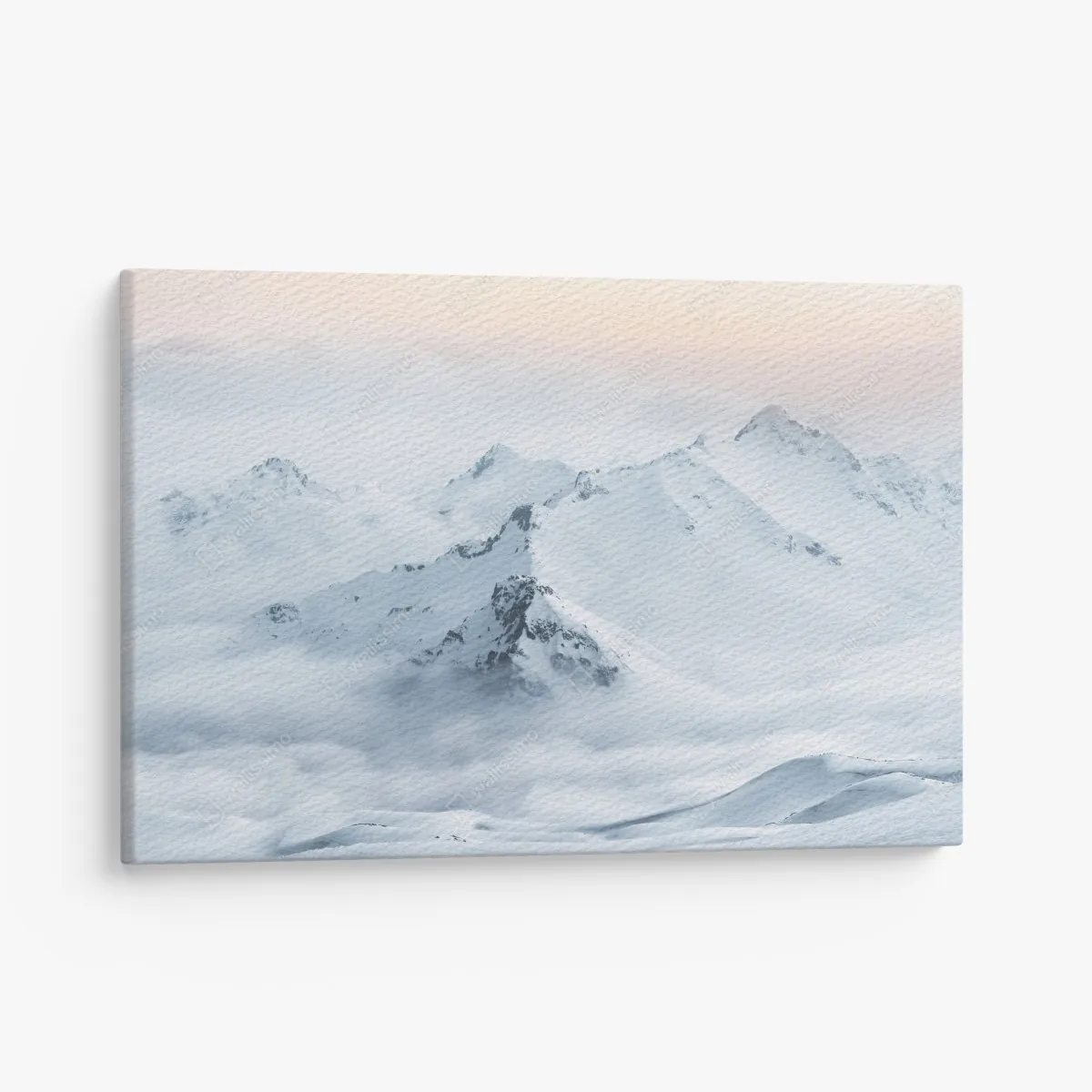 Ein ruhiger Panoramablick auf die schneebedeckten Berge des Kaukasus in sanftem Pastelllicht, ideal zur Gestaltung beruhigender Wohnräume.