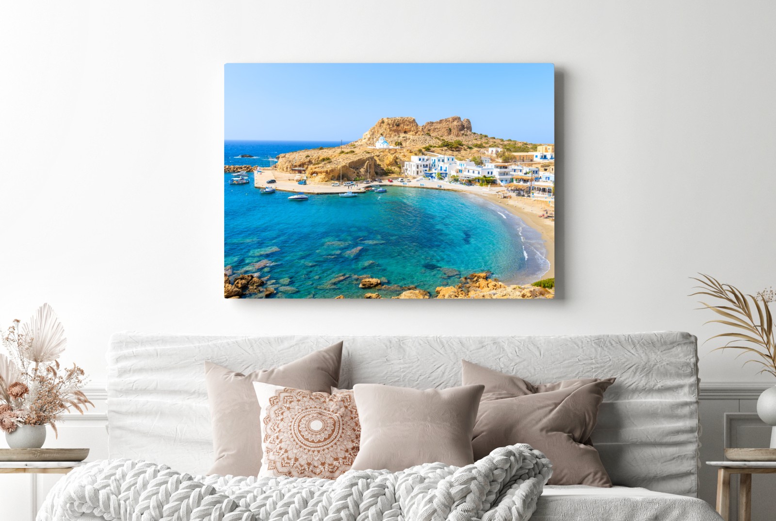Erleben Sie das türkisfarbene Wasser und die weiß getünchten Häuser von Finiki auf Karpathos und bringen Sie mediterranen Charme in Ihr Zuhause.