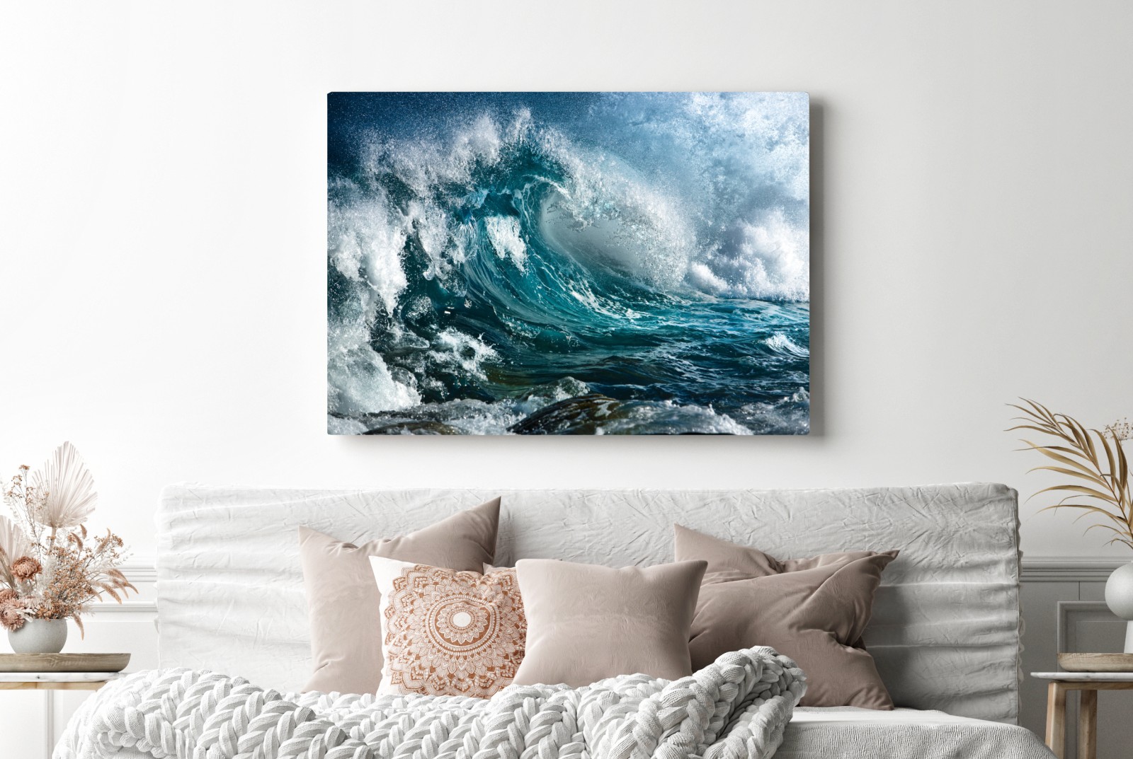 Dynamische Nahaufnahme einer brechenden türkisen Welle, die jedem Raum Energie und natürliche Ruhe verleiht.