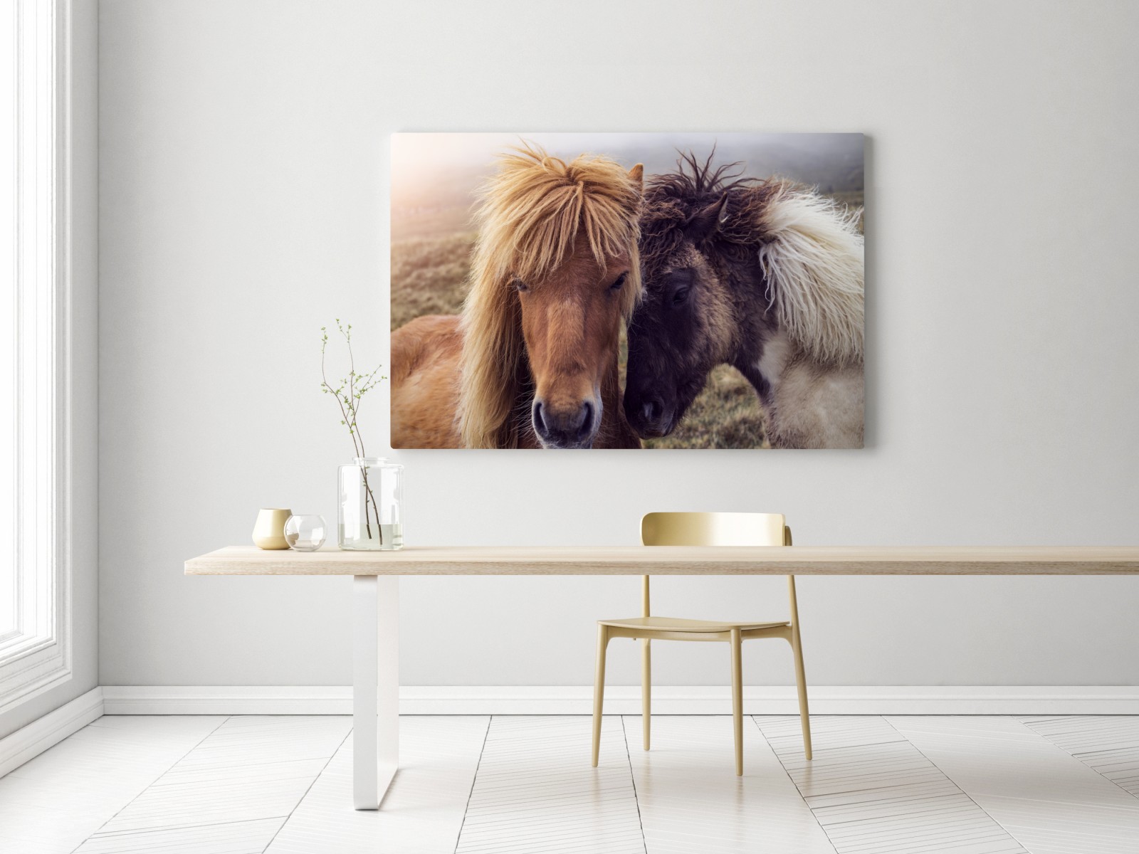 Eine Nahaufnahme von zwei Pferden auf den nebligen Färöer-Inseln, die rustikale Ruhe und natürliche Eleganz in Ihr Zuhause bringt.