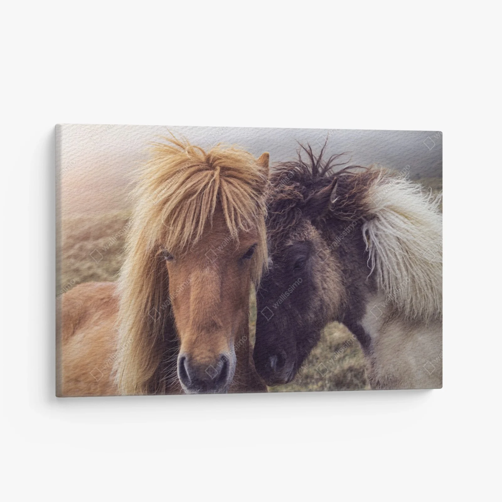 Eine Nahaufnahme von zwei Pferden auf den nebligen Färöer-Inseln, die rustikale Ruhe und natürliche Eleganz in Ihr Zuhause bringt.MehrWeniger
