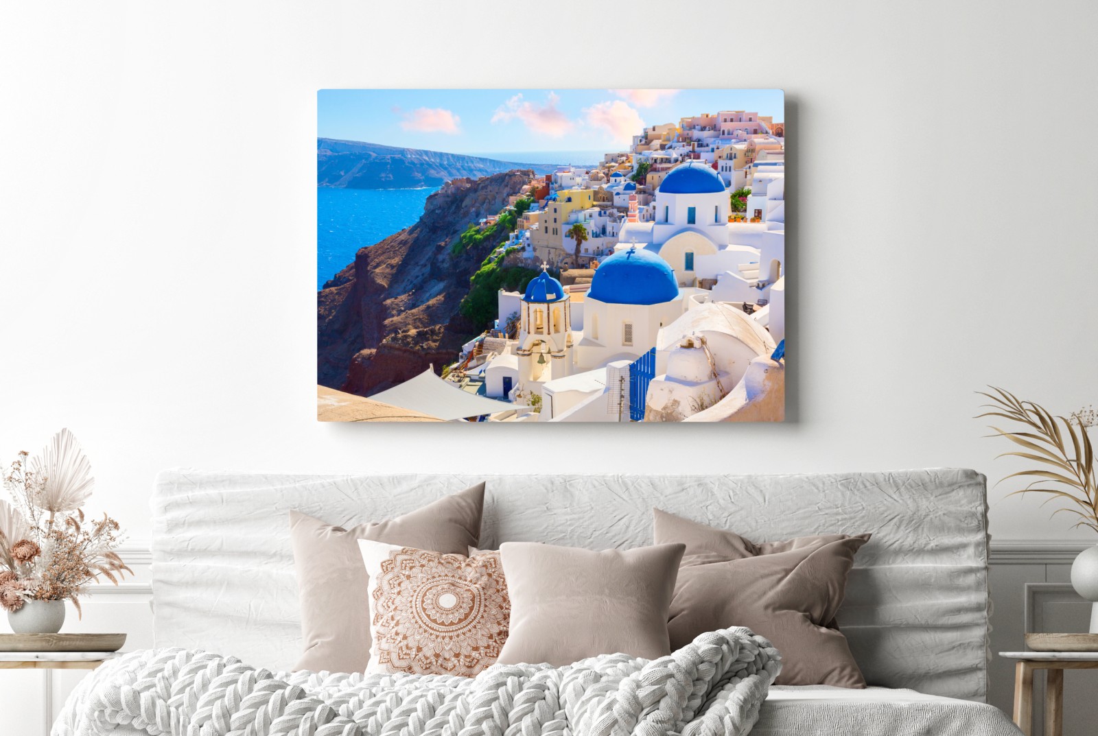Heller Küstenblick auf Santorinis ikonische blaue Kuppeln und weiß getünchte Häuser mit Blick auf die Ägäis, der mediterrane Charme in Ihr Zuhause bringt.