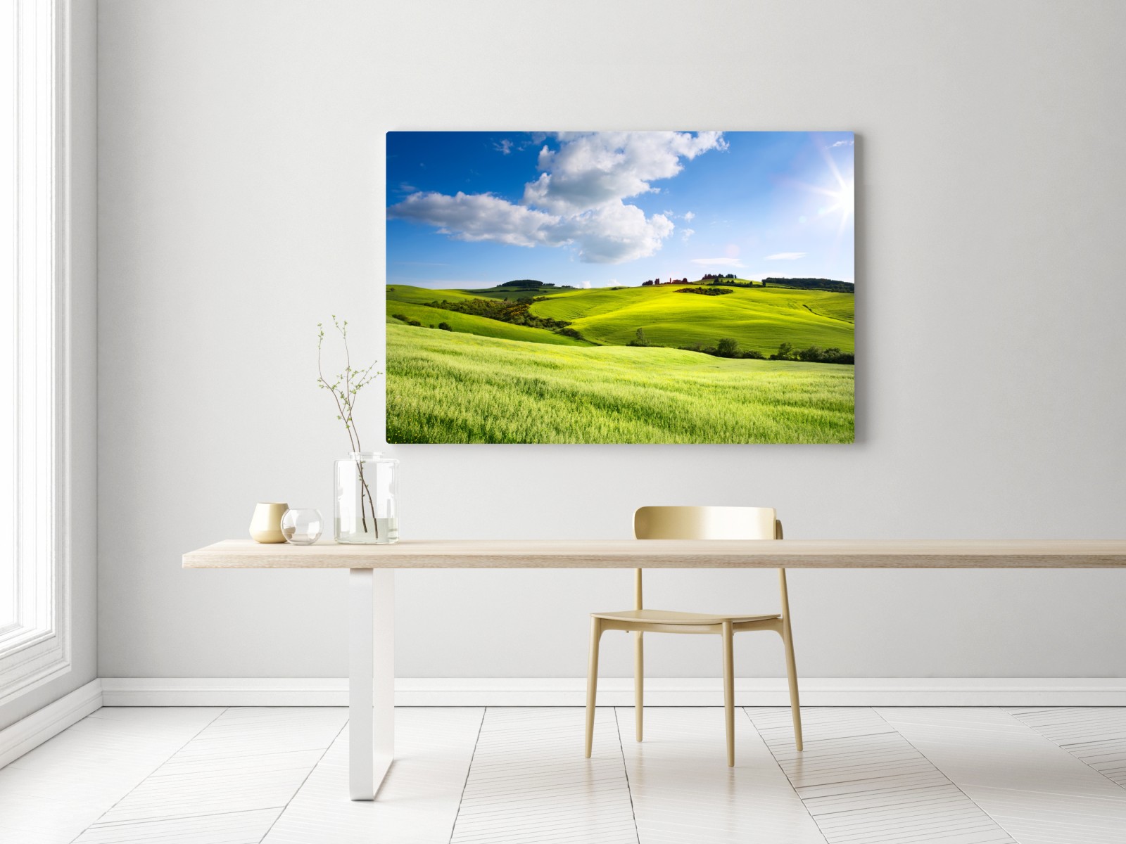Bringen Sie Ruhe in Ihr Zuhause mit einem lebendigen Blick auf die sanften Hügel der Toskana im warmen Licht des Sonnenuntergangs.