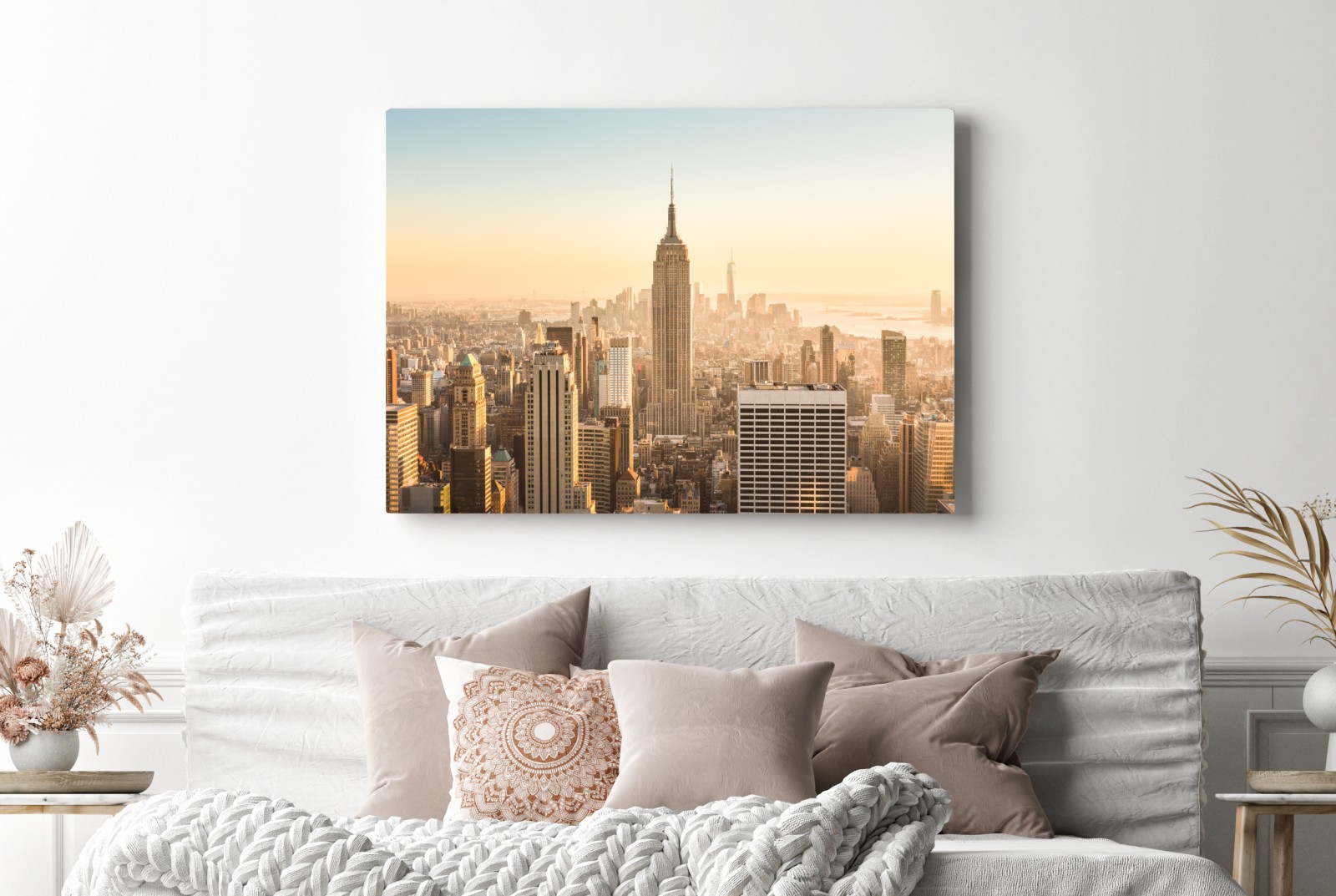 Warme goldene Ansicht der New York Skyline mit ikonischen Wolkenkratzern, ideal zur Aufwertung moderner Innenräume.
