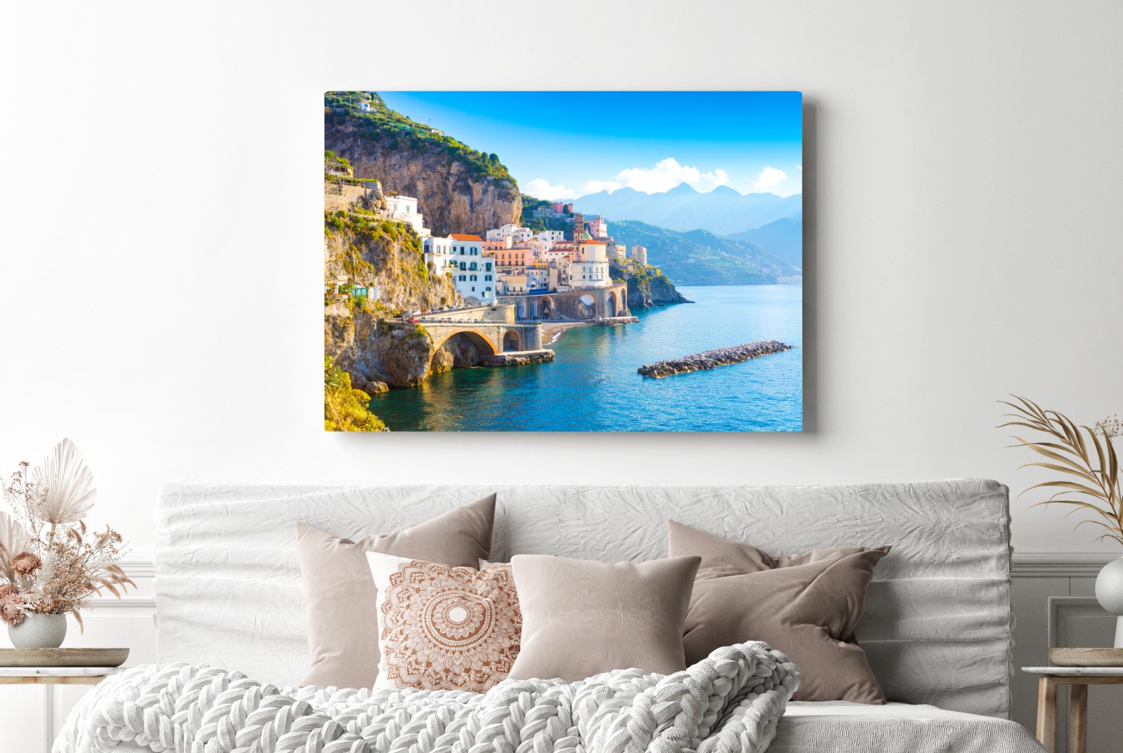 Heller mediterraner Küstenblick mit bunten Häusern an steilen Klippen und Bogenbrücken, perfekt um Ihrem Raum eine maritime Atmosphäre zu verleihen.