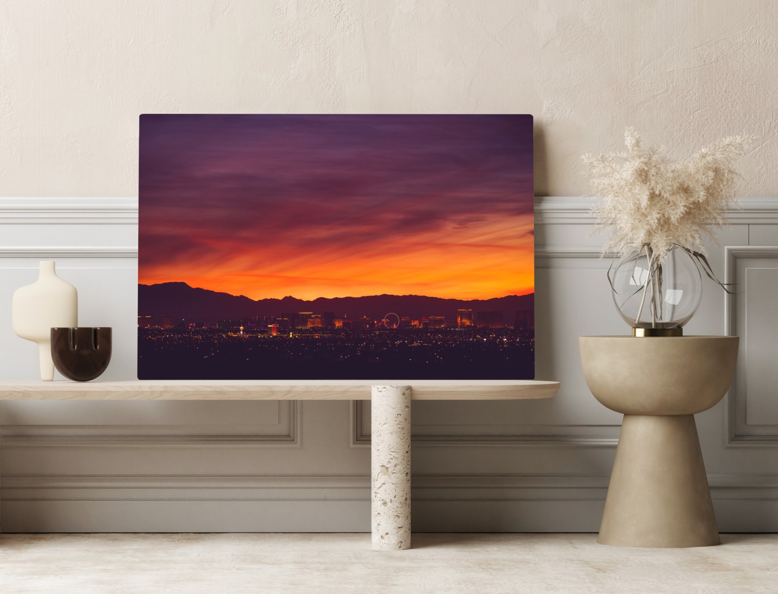 Dramatische Las Vegas Skyline bei Sonnenuntergang mit intensiven orange-violetten Himmelsfarben und funkelnden Stadtlichtern, perfekt zur Gestaltung stimmungsvoller Innenräume.