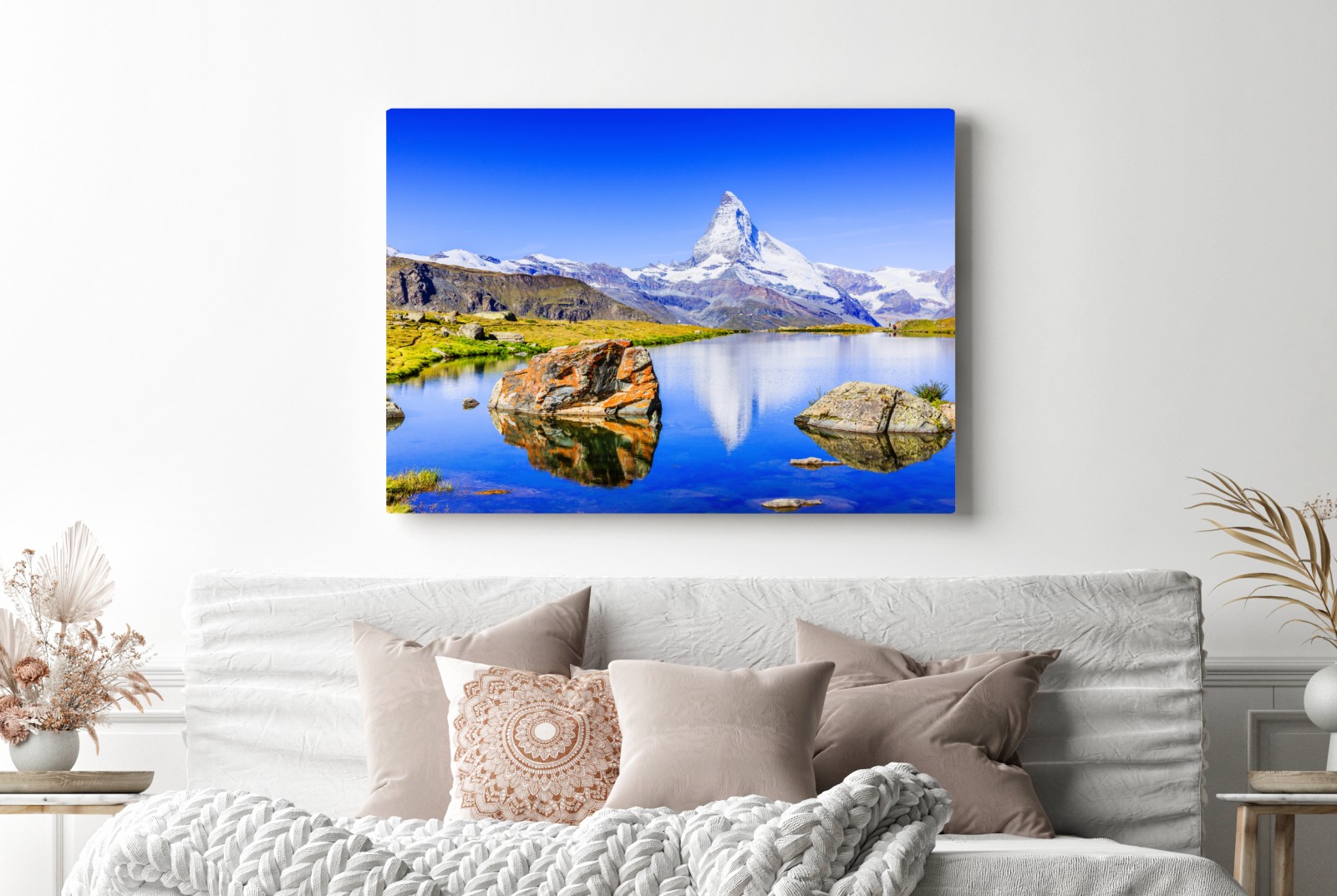 Ruhige alpine Szene mit dem im Stellisee gespiegelten Matterhorn, ideal, um bergige Gelassenheit in Ihr Zuhause zu bringen.